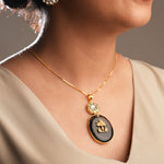 .A refined long chain featuring detailed temple motifs and lustrous pearls, kundan and gemstones, blending heritage with sophistication, orange kempstone at bottom.