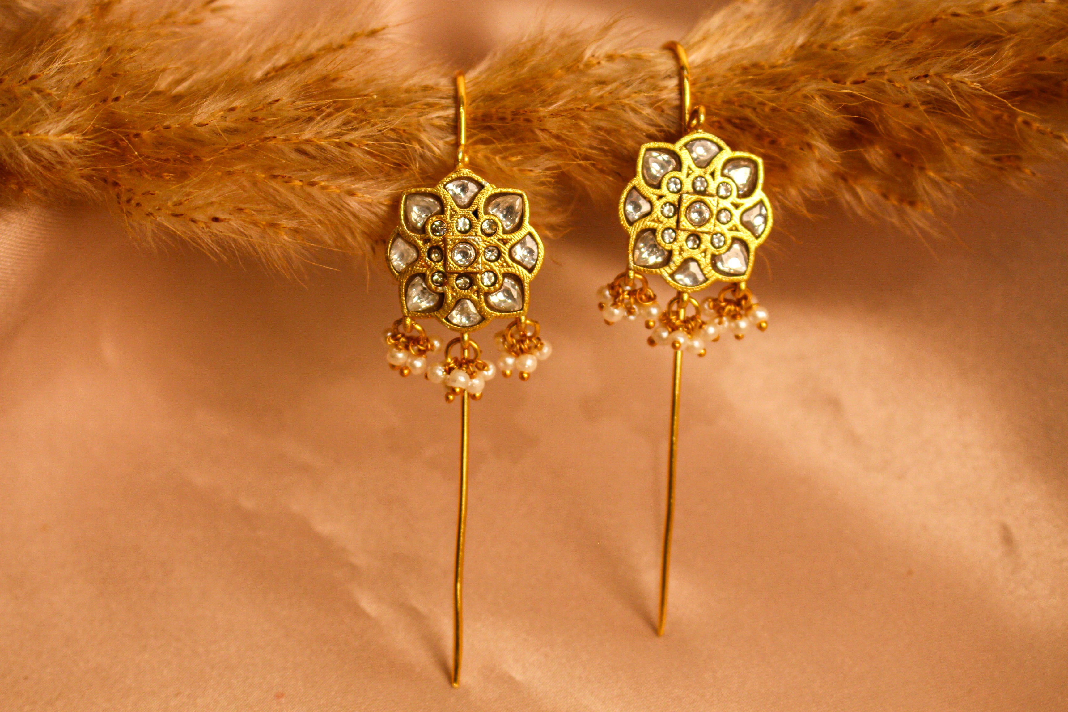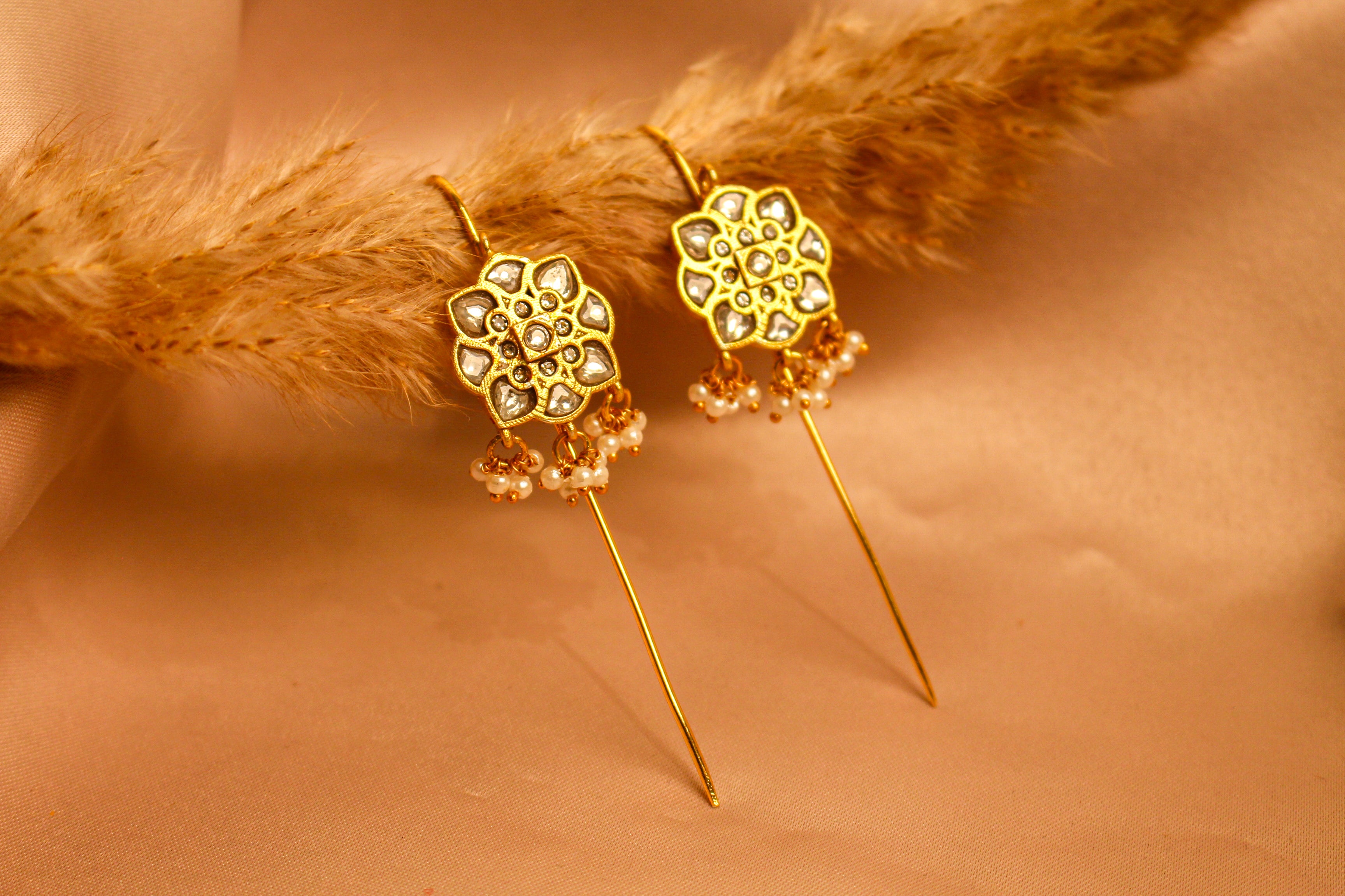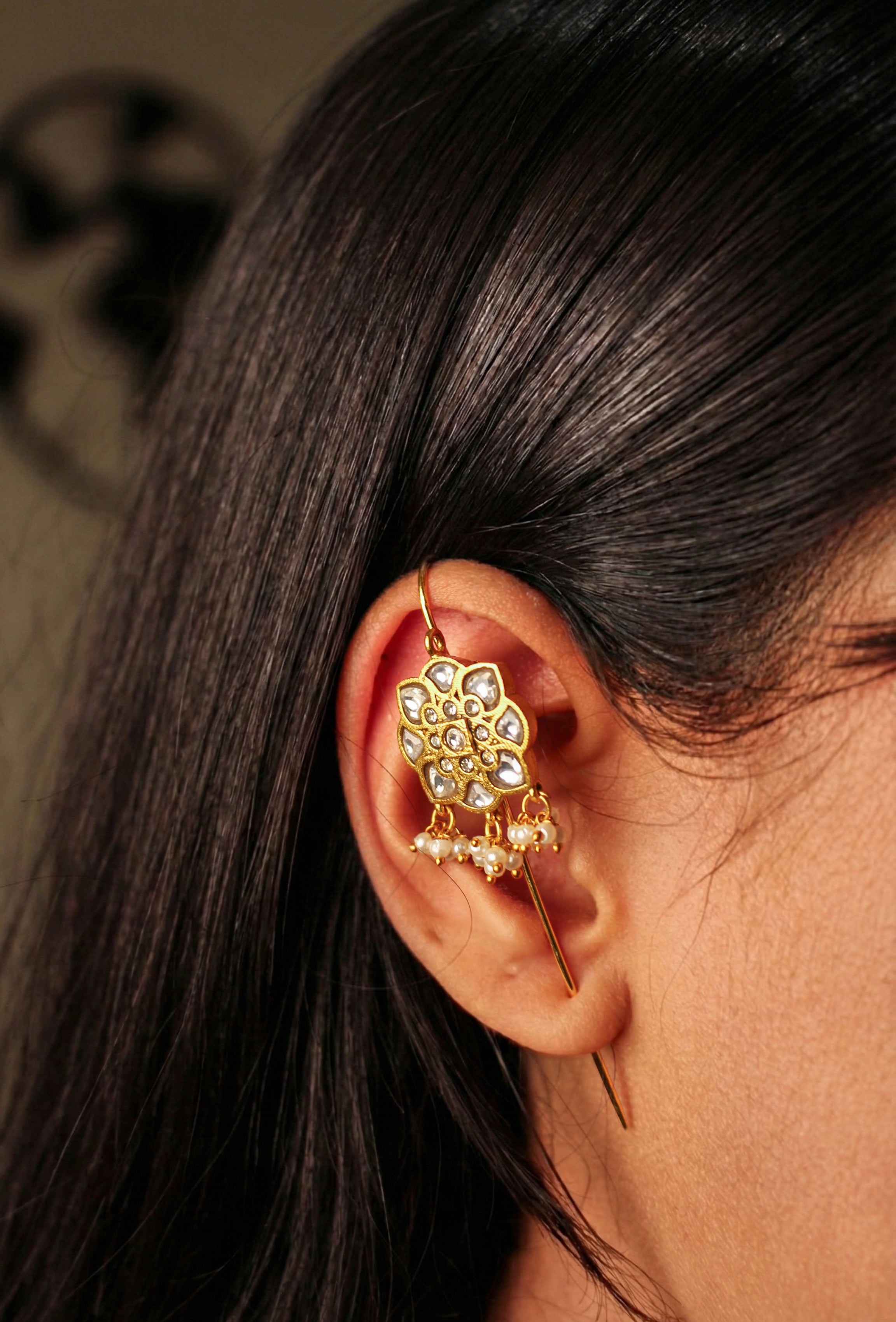 Inspired by the grandeur of Mughal-era artistry and traditional Indian motifs, this statement earcuff showcases timeless design through intricate meenakari work, delicate cut-work stone detailing, and graceful floral patterns accented with pearls and kundan elements.