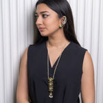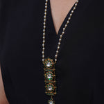 A classic long chain adorned with intricate temple-inspired motifs and delicate pearl and kundan accents, perfect for a traditional touch.