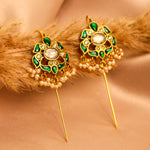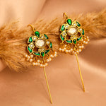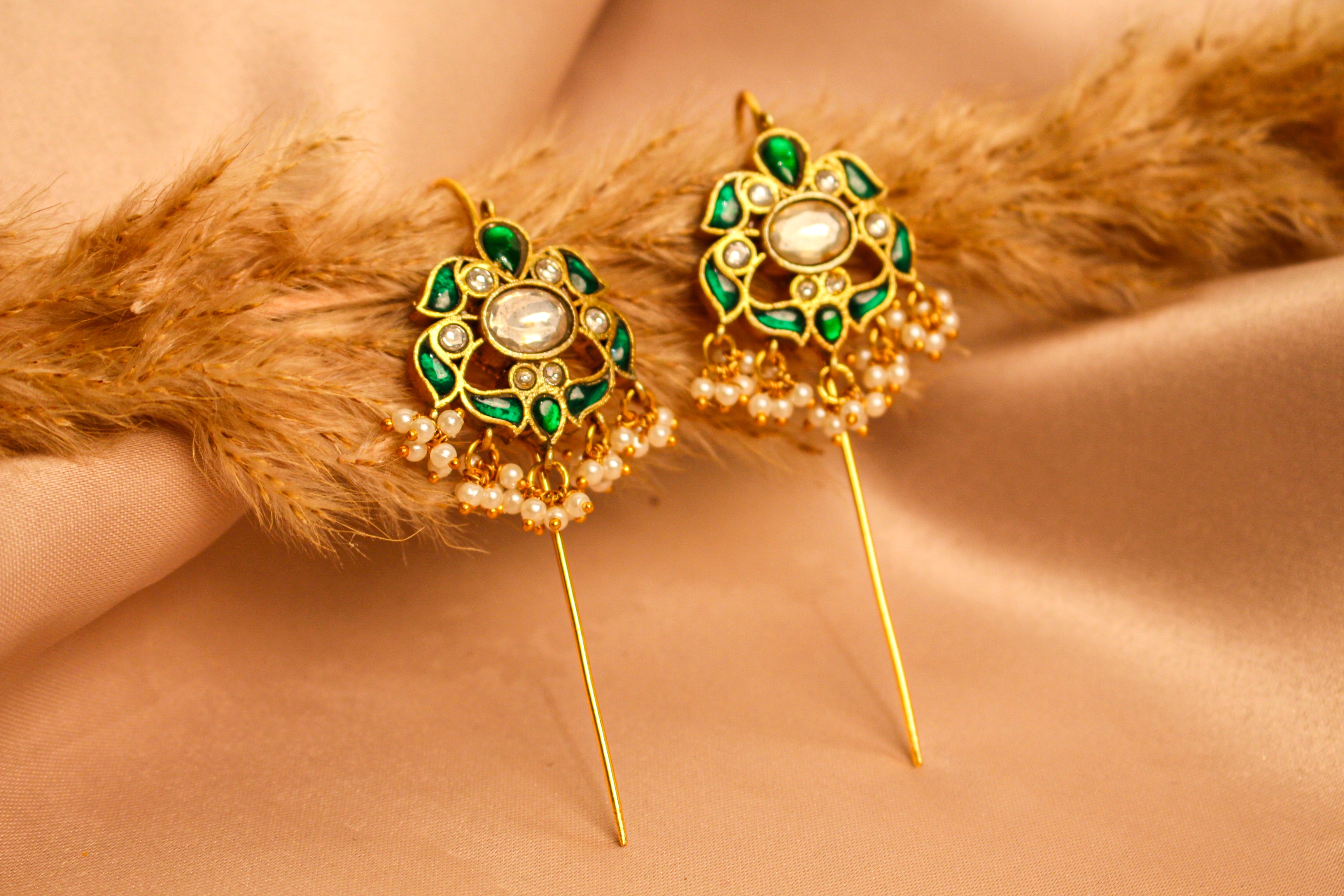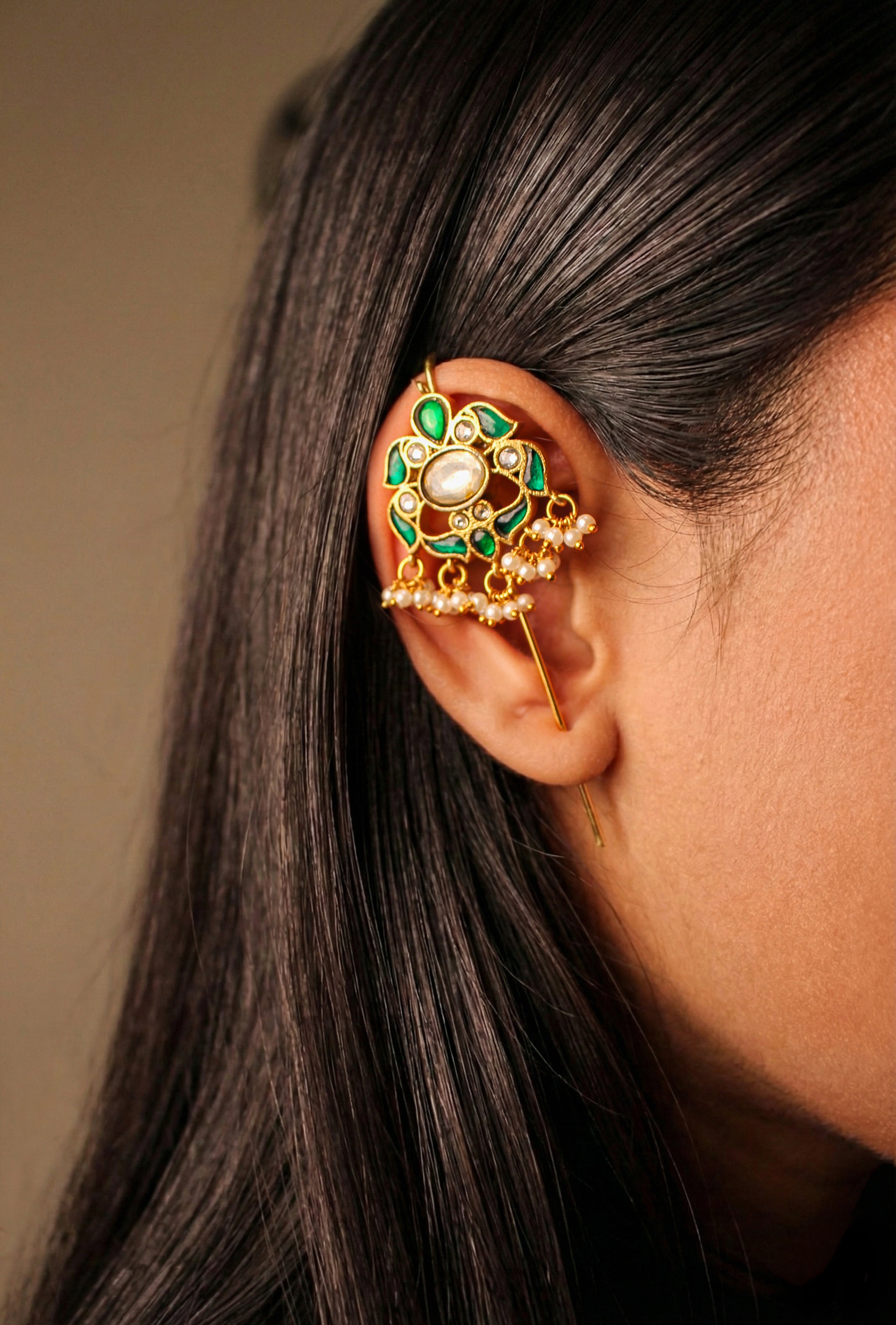 Inspired by the grandeur of Mughal-era artistry and traditional Indian motifs, this statement earcuff showcases timeless design through intricate meenakari work, delicate cut-work stone detailing, and graceful floral patterns accented with pearls and kundan elements.