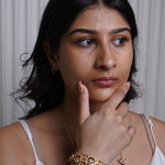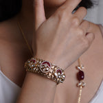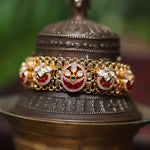 A graceful bracelet featuring intricate temple-inspired carvings, kundan embellishments, and a rich gold-plated finish, perfect for a traditional touch.