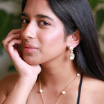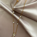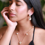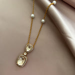 Lightweight, sleek, kundan, and swarovski diamond. gold-plated chain with sophisticated pearls. with golden earrings adorned with moozanite polki stone