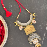 Inspired by traditional designs, this necklace is crafted with temple motifs, red colored Celestial elements fused with heritage artistry Finished forming on a tarnish-free copper base