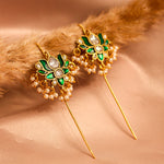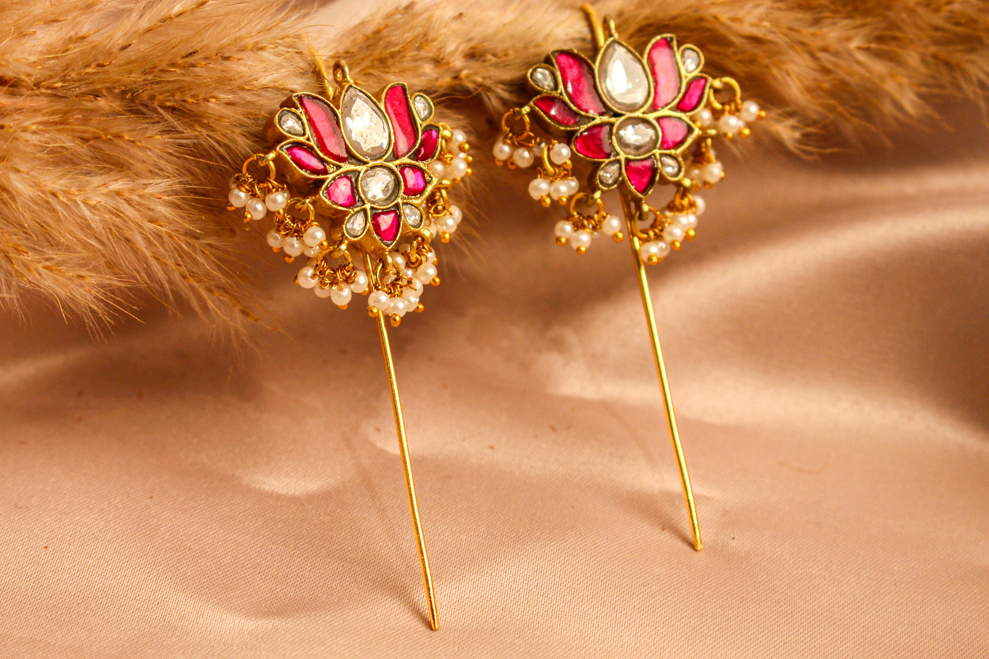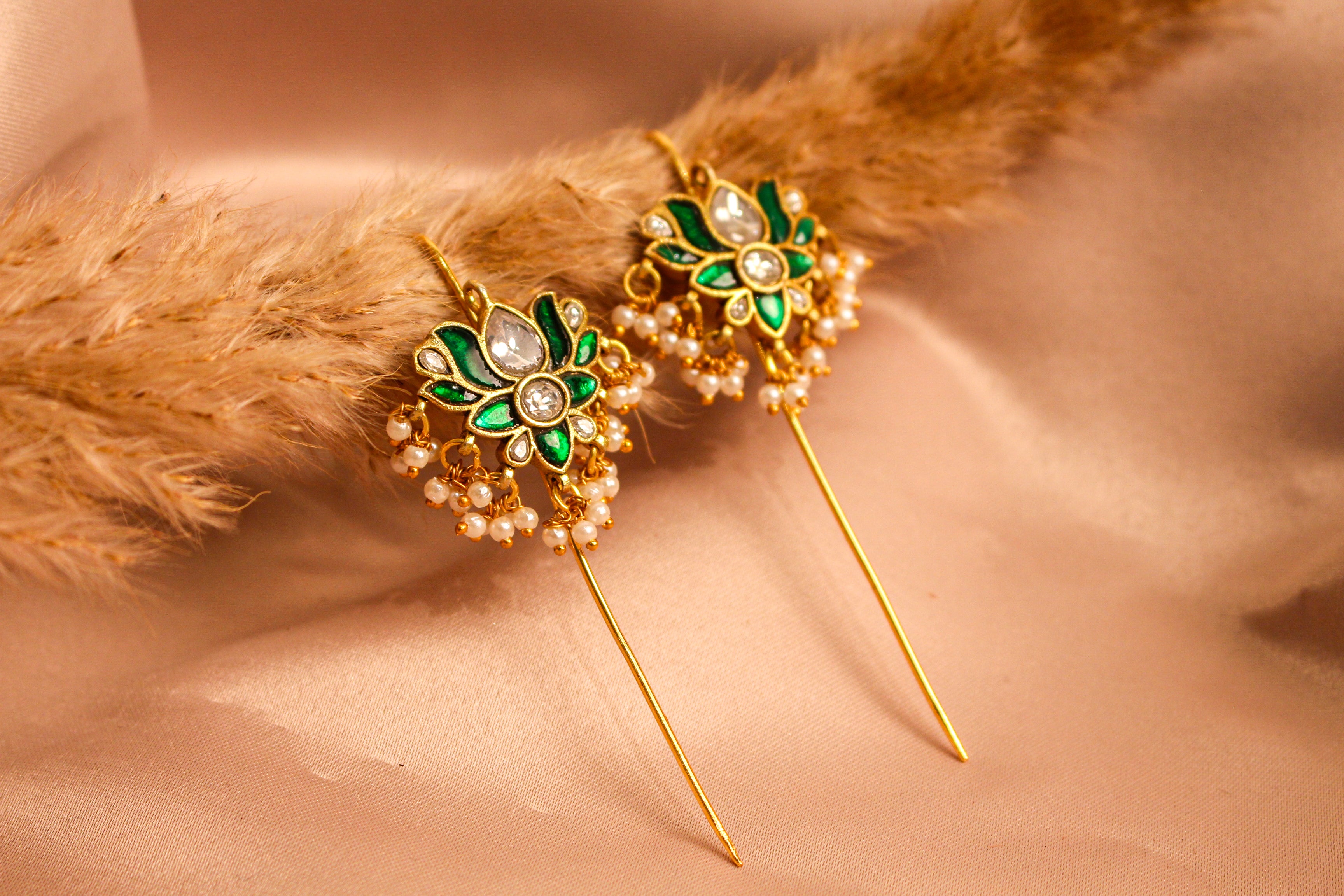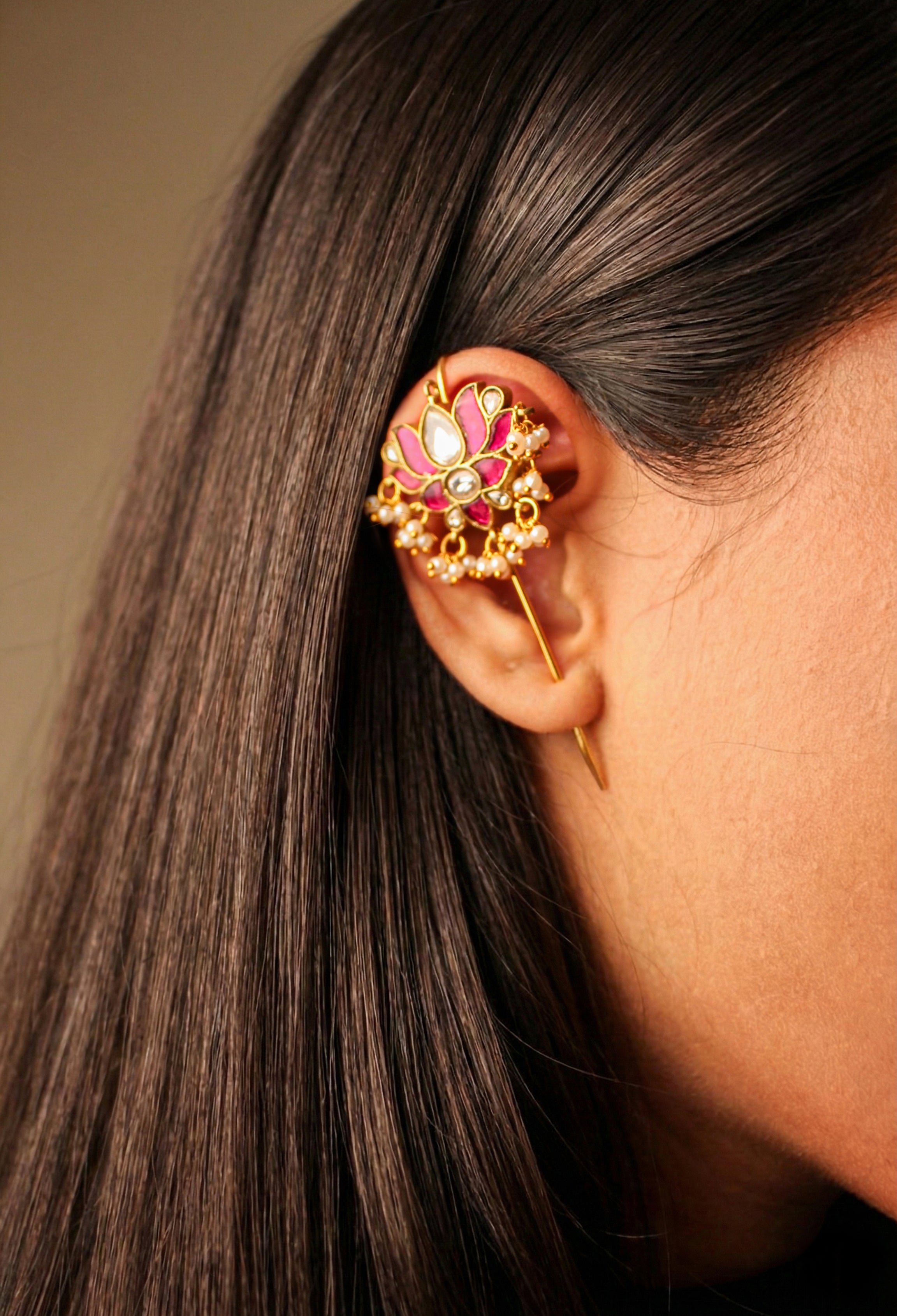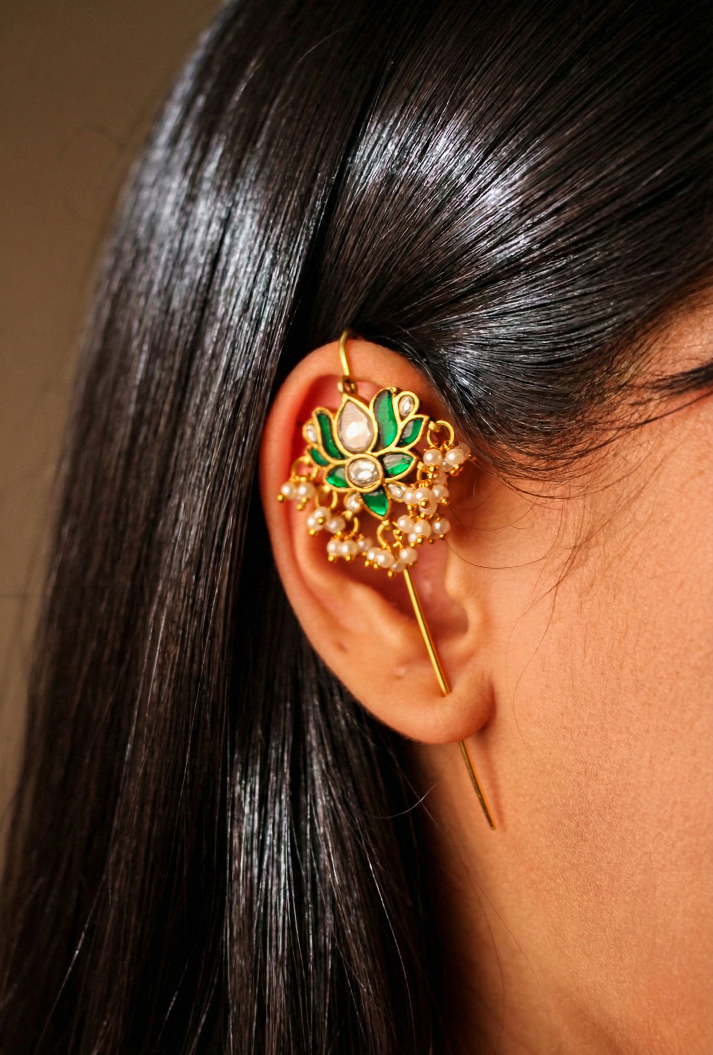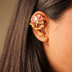 Inspired by the grandeur of Mughal-era artistry and traditional Indian motifs, this statement earcuff showcases timeless design through intricate meenakari work, delicate cut-work stone detailing, and graceful floral patterns accented with pearls and kundan elements.