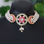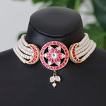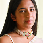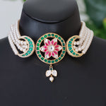 Elegant pink and green temple choker, adorned with lustrous pearls, exudes timeless beauty, perfect blend of grace and sophistication.