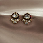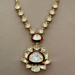Delicate red-colored, moozanite polki stone necklace with earrings featuring rich red-hued moozanite polki stones, kundan embellishments, exuding elegance.