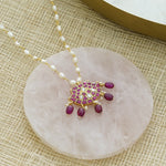 Unique necklace made with pearls, silver, kundan, kemp stones, and red onyx