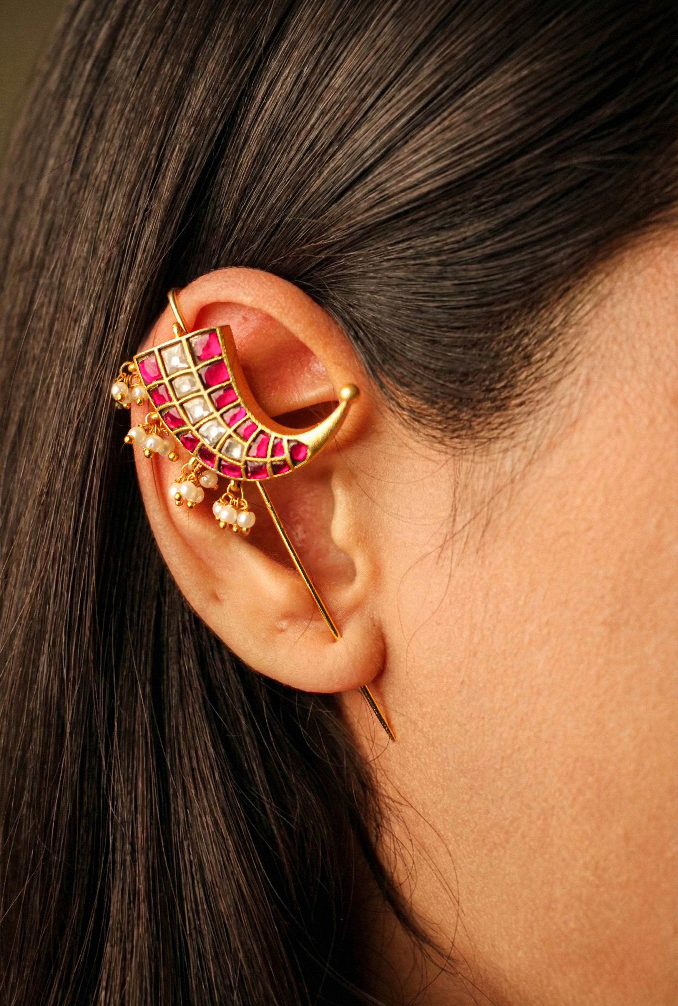 Inspired by the grandeur of Mughal-era artistry and traditional Indian motifs, this statement earcuff showcases timeless design through intricate meenakari work, delicate cut-work stone detailing, and graceful floral patterns accented with pearls and kundan elements.