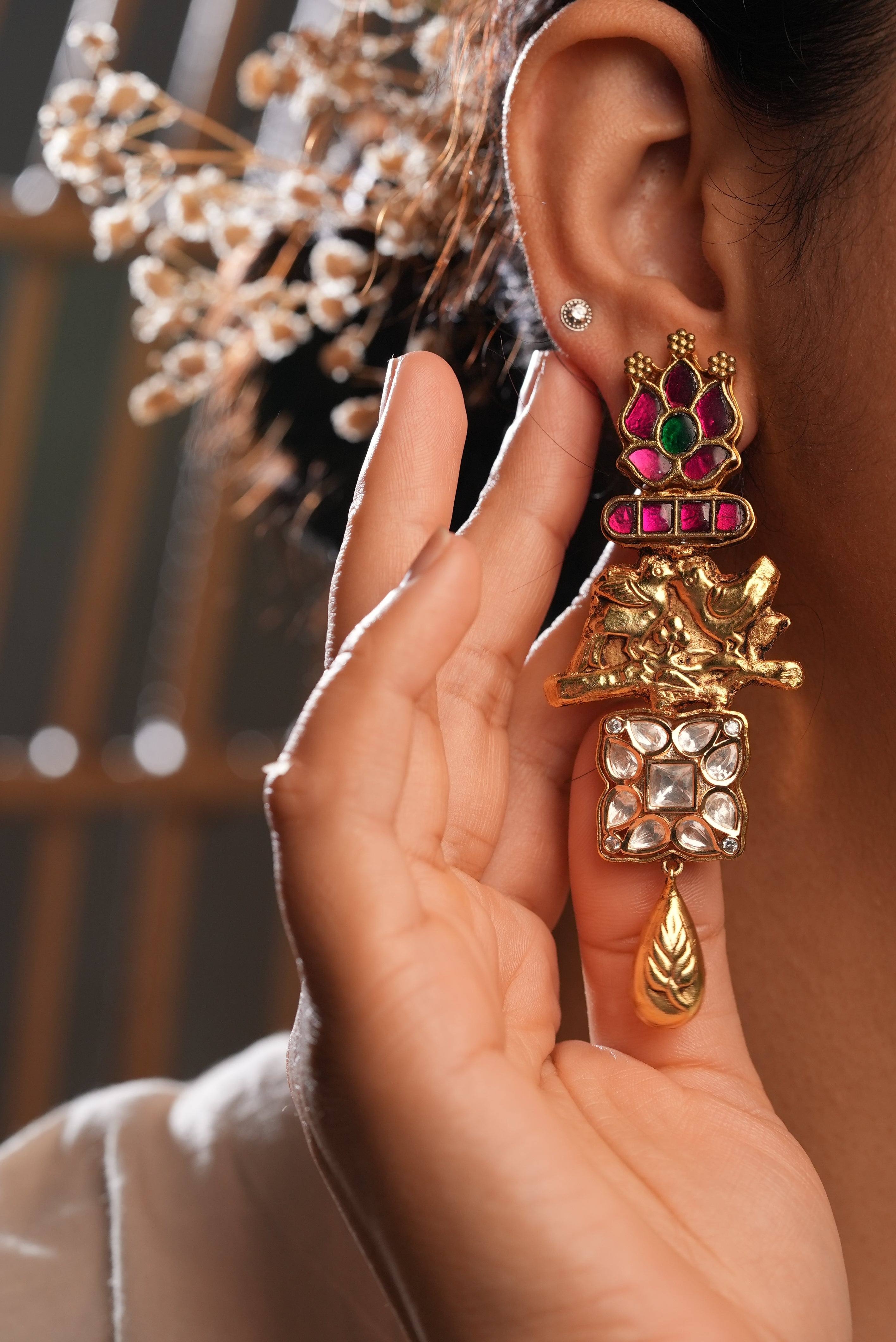 Earrings curated with semi-precious stones and inspired by tropical flora and fauna.