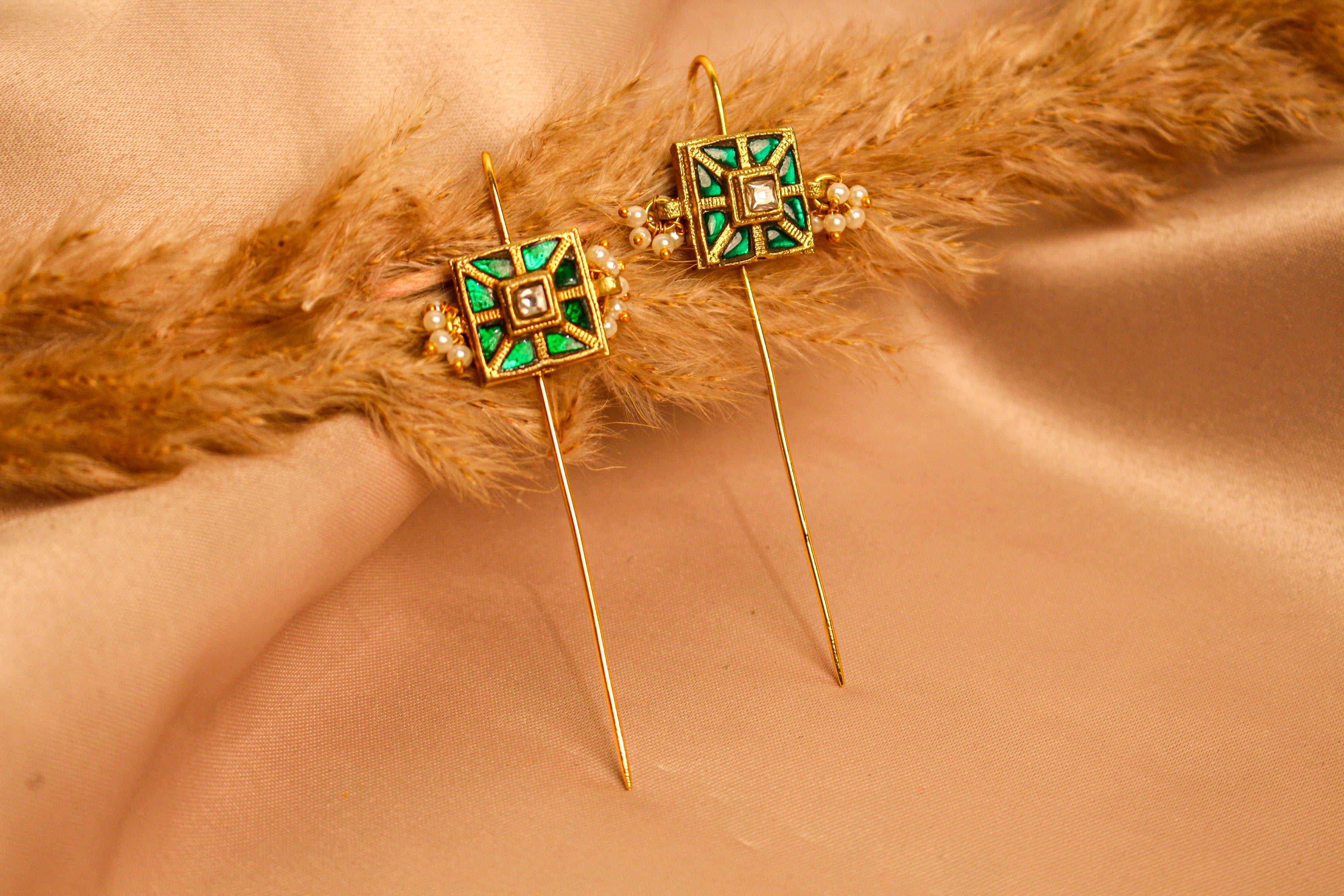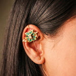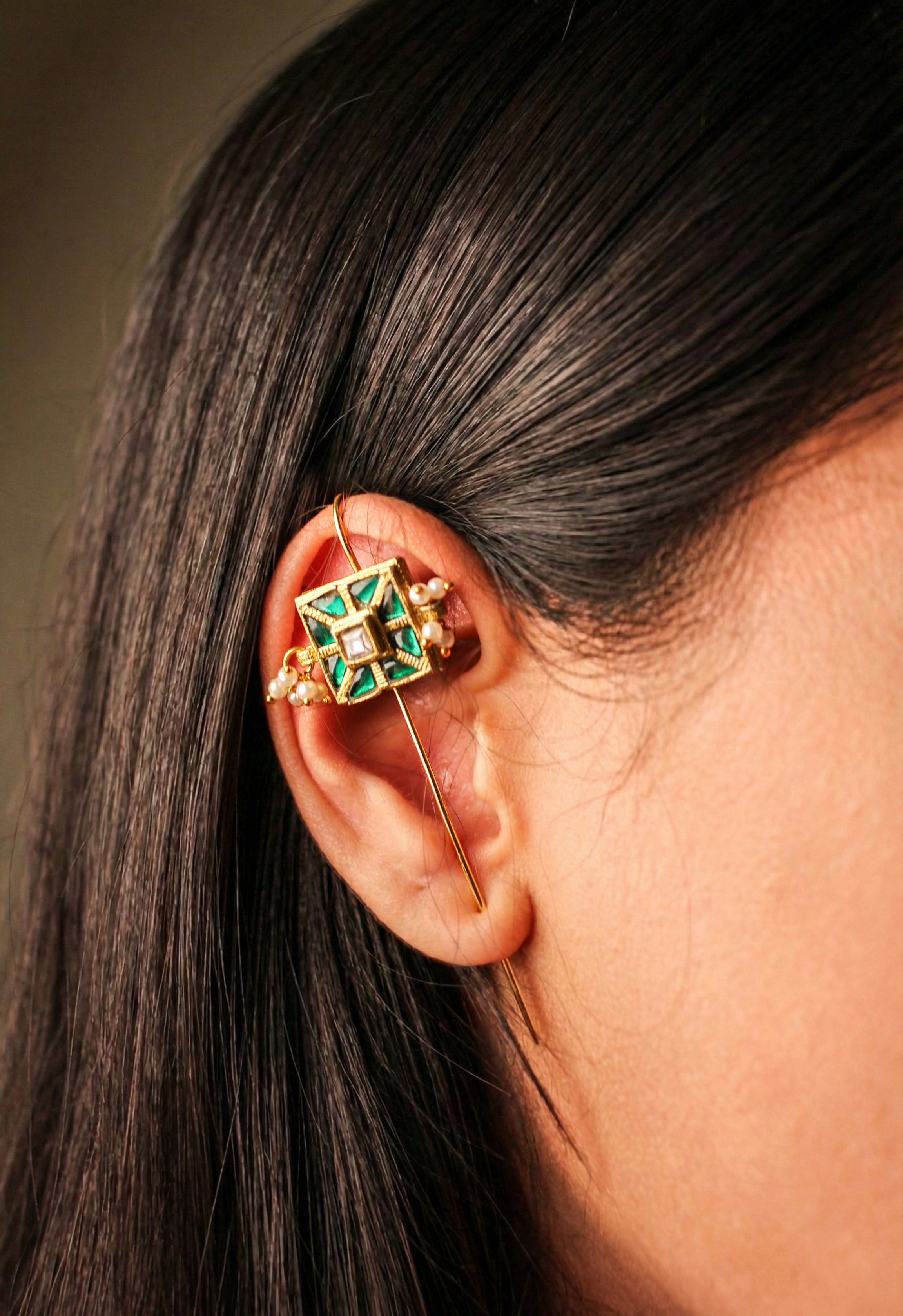 Inspired by the grandeur of Mughal-era artistry and traditional Indian motifs, this statement earcuff showcases timeless design through intricate meenakari work, delicate cut-work stone detailing, and graceful floral patterns accented with pearls and kundan elements.