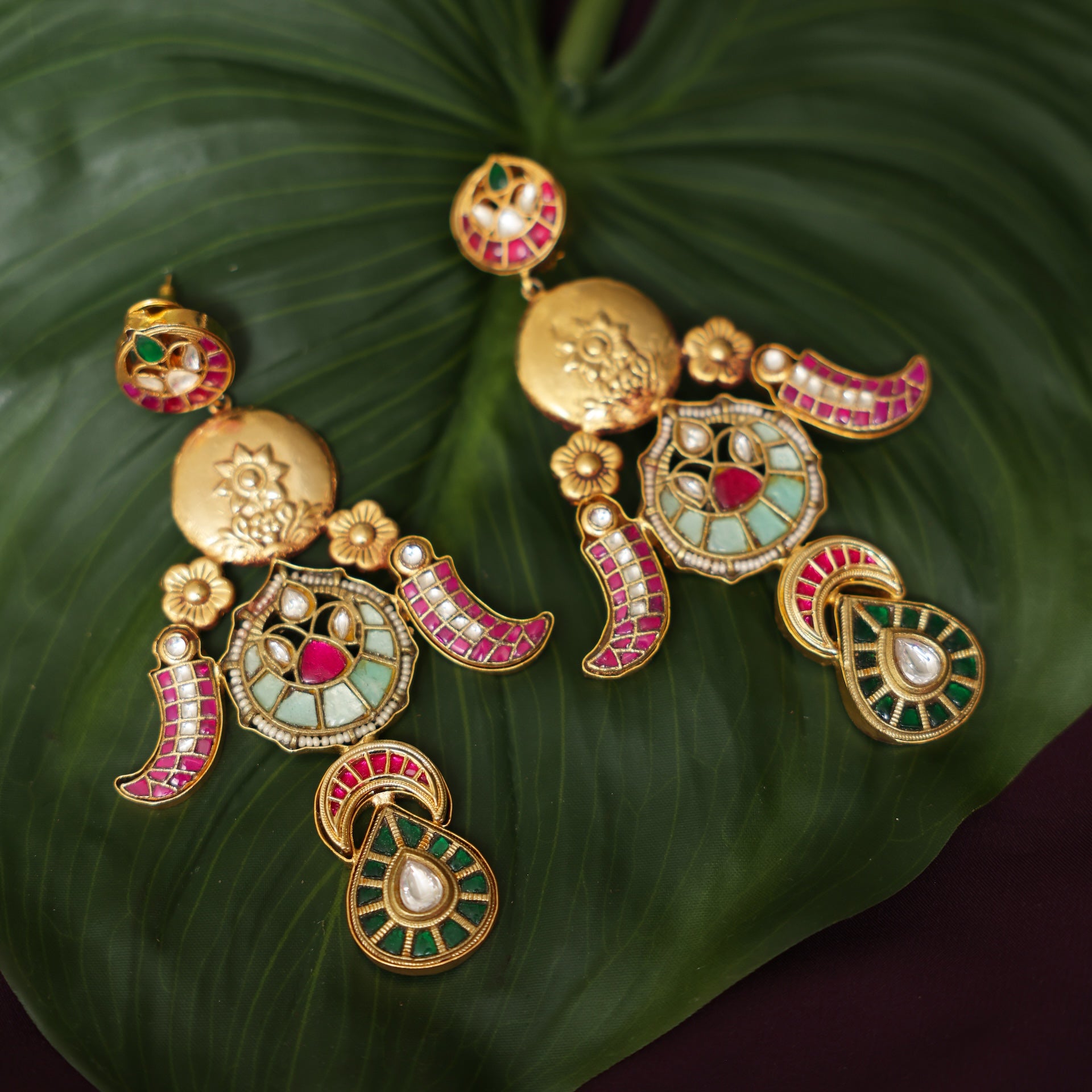 intricate jumkas with pink, mint green,and colofulr Kundan embellishments and gold-plated detailing add a graceful touch to any look.
