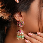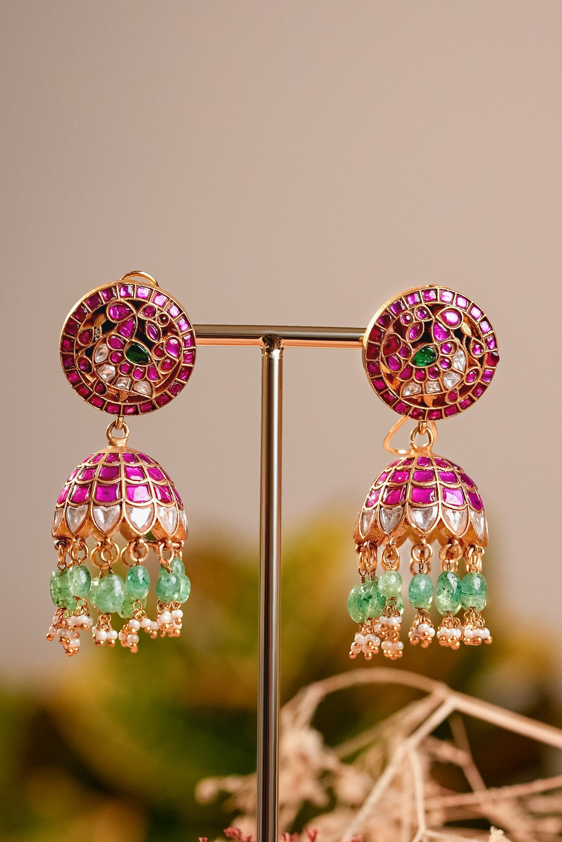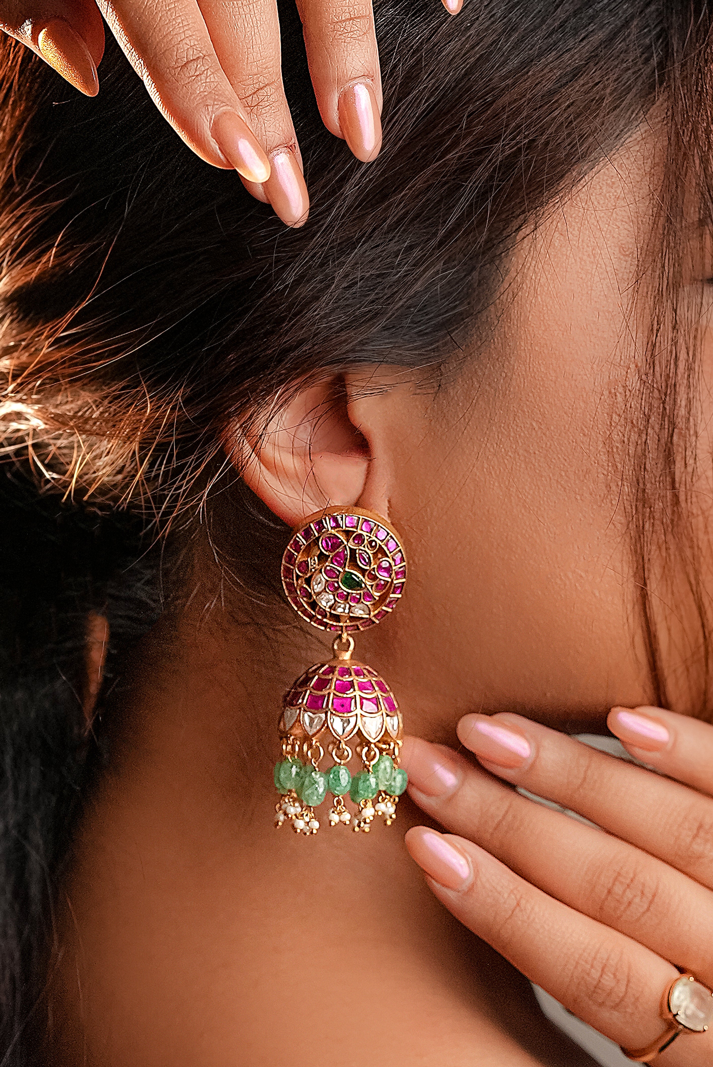 Majestic Jhumka, Kundan Circle at Top with Green Semi-precious stone Drop Design