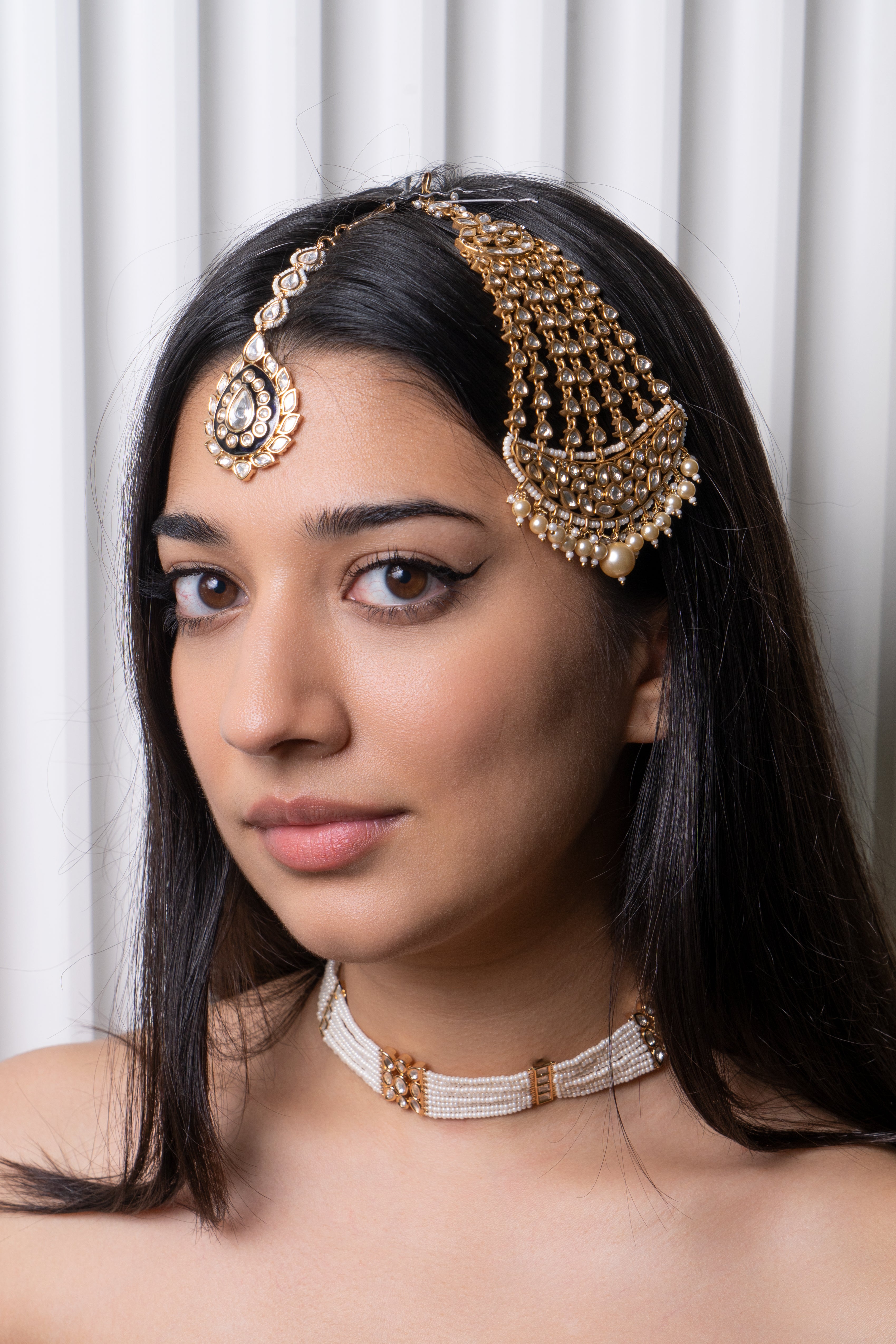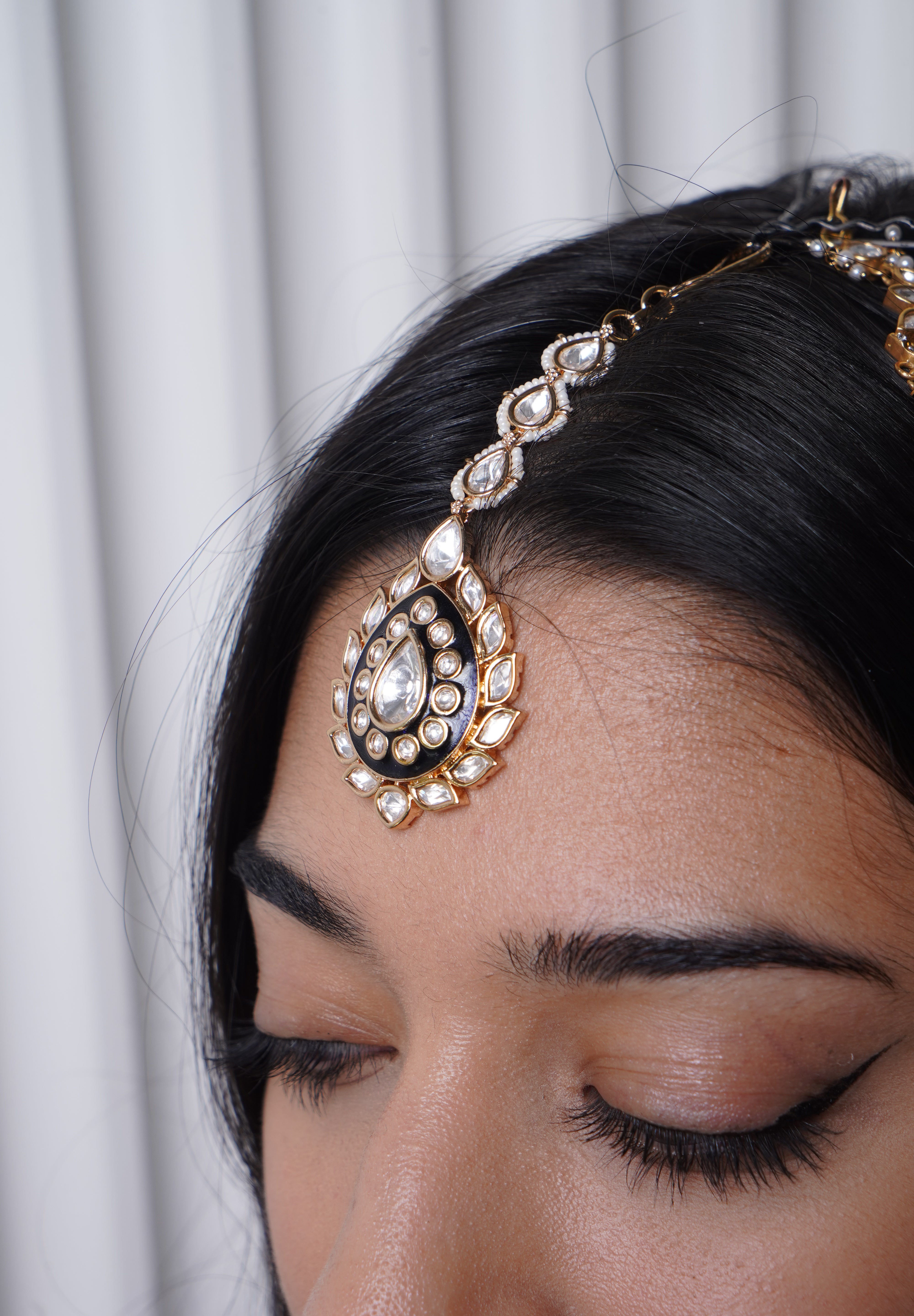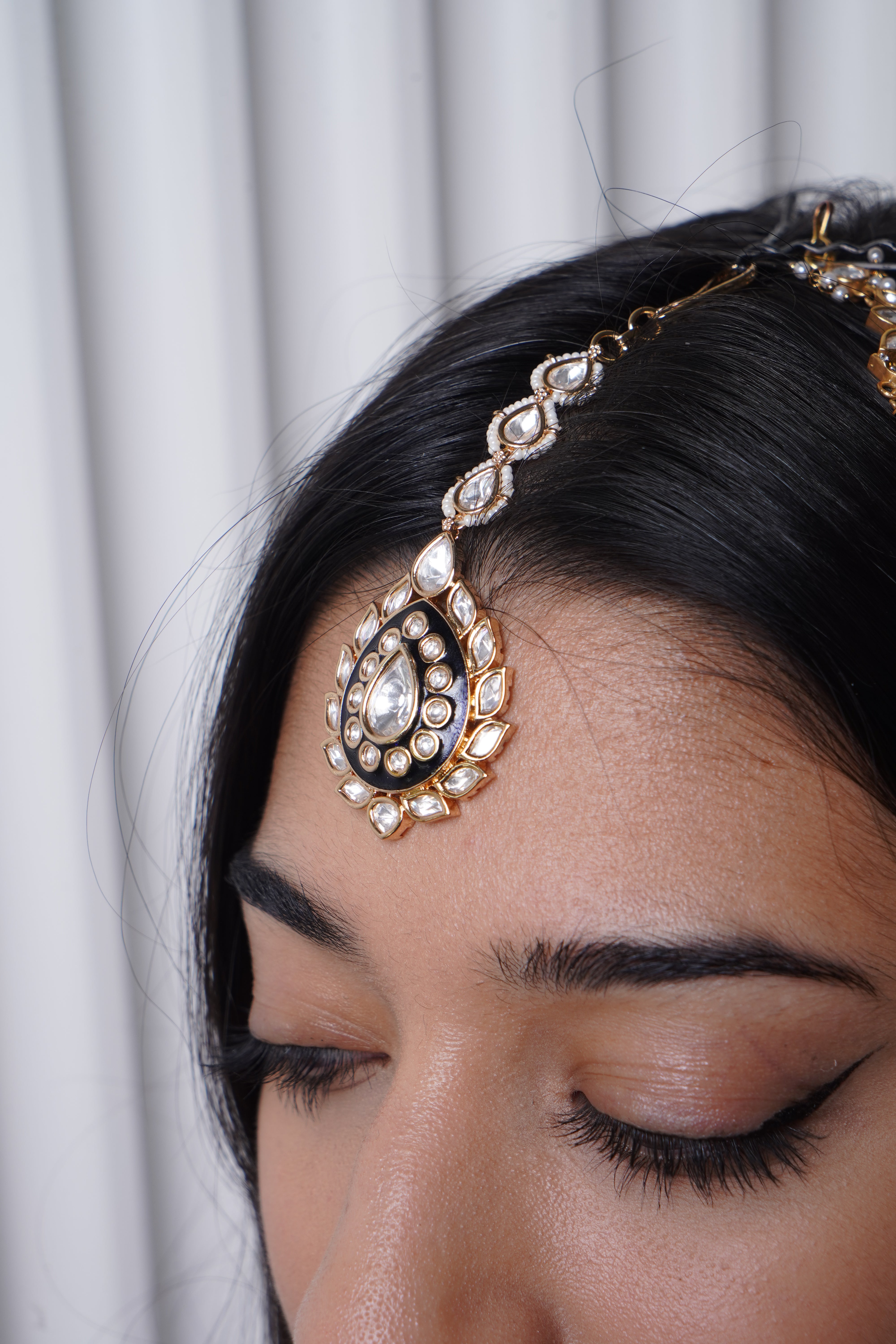 A classic maang tika featuring intricate kundan work for a timeless traditional look.