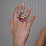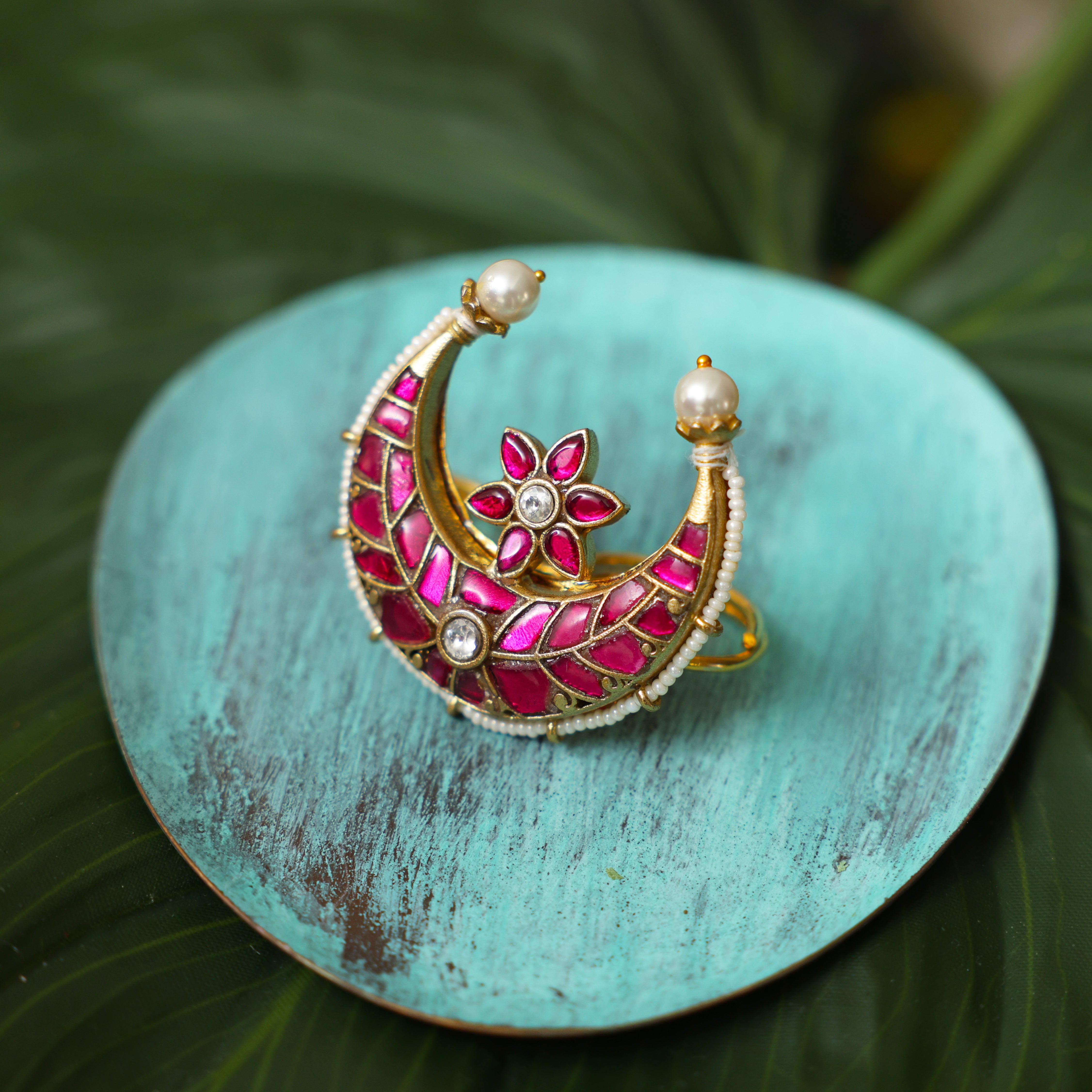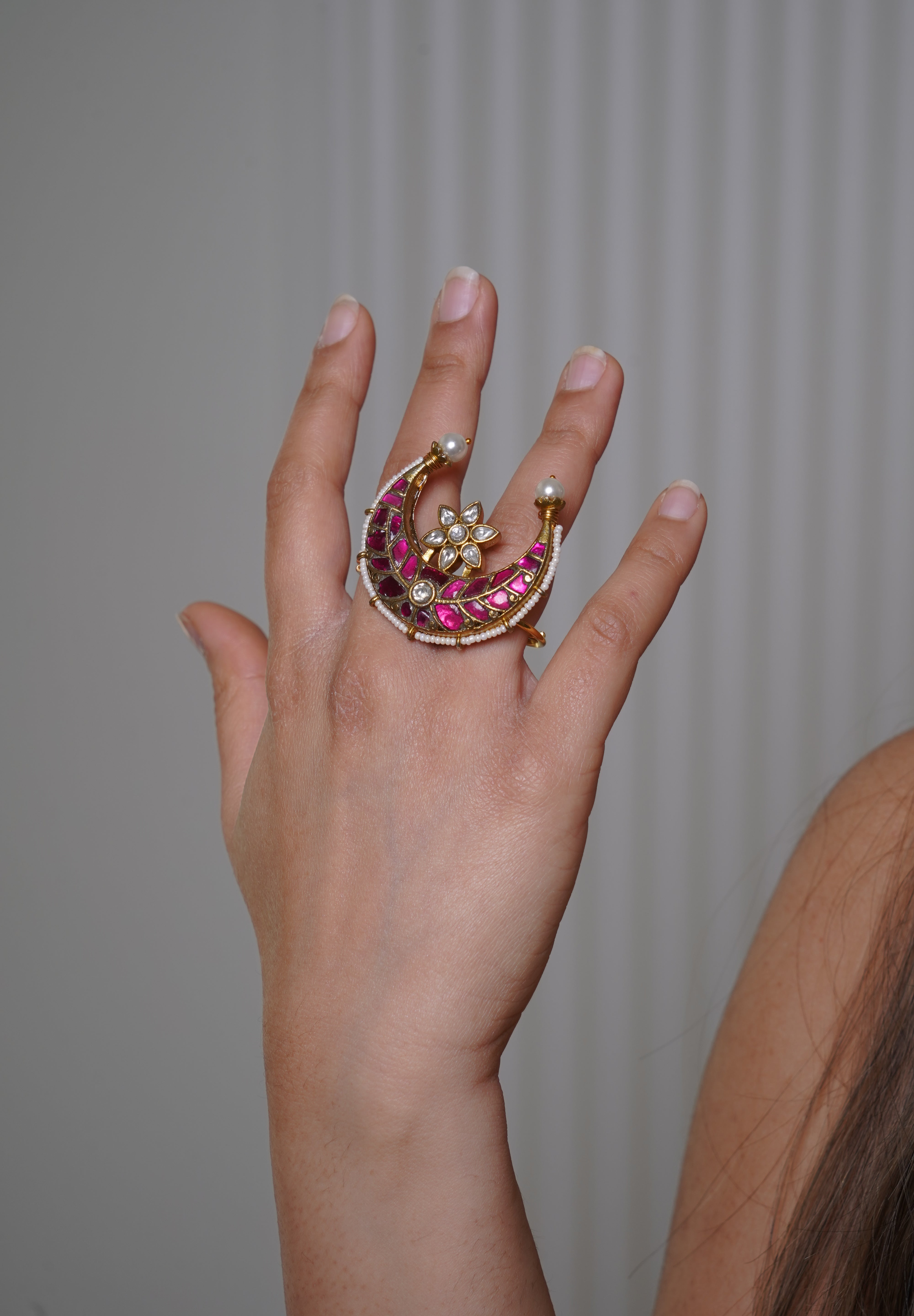 Ruby Crescent Pearl Ring: pink-hued crescent ring adorned with pearls and gold detailing - Finger Ring Collection