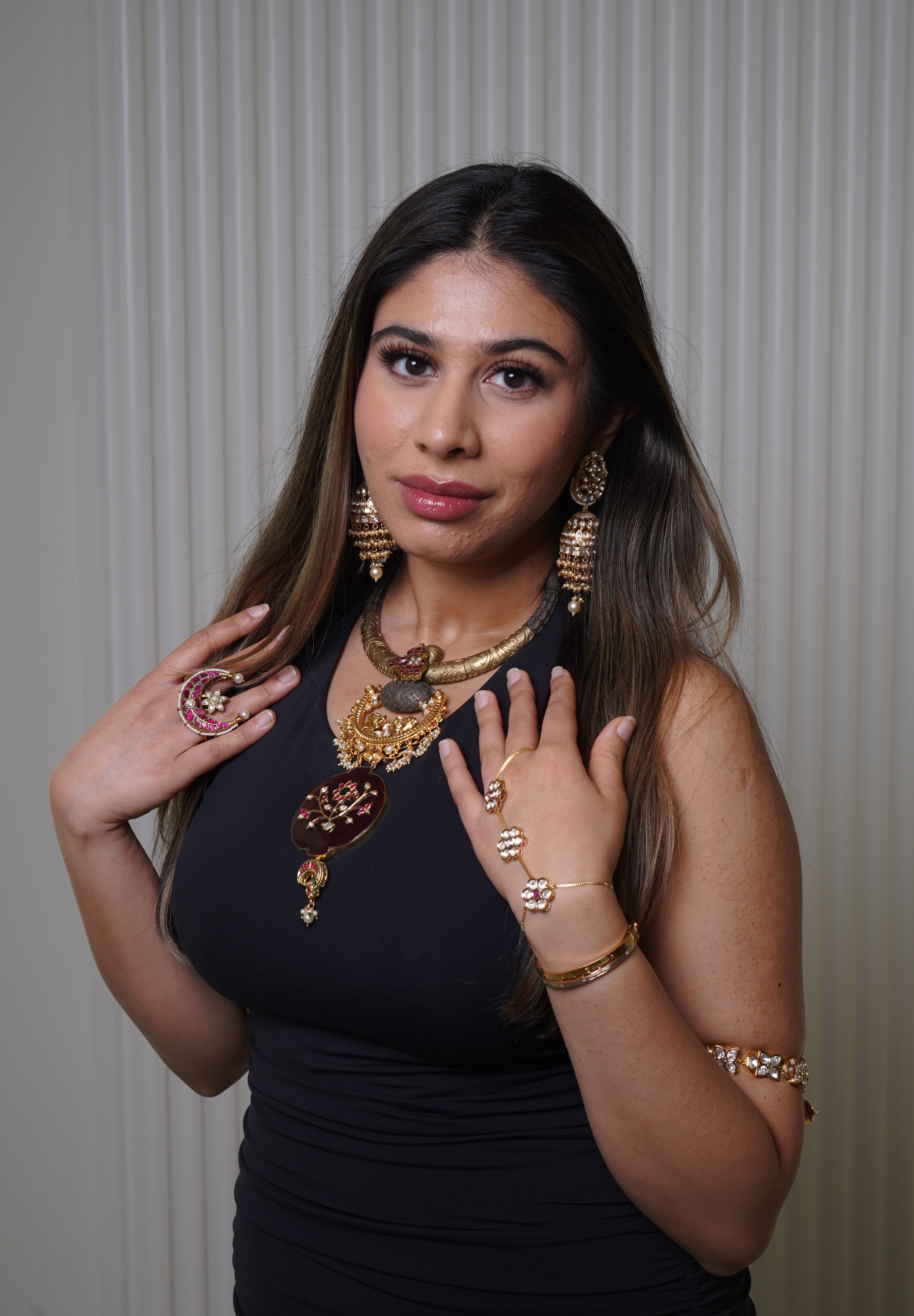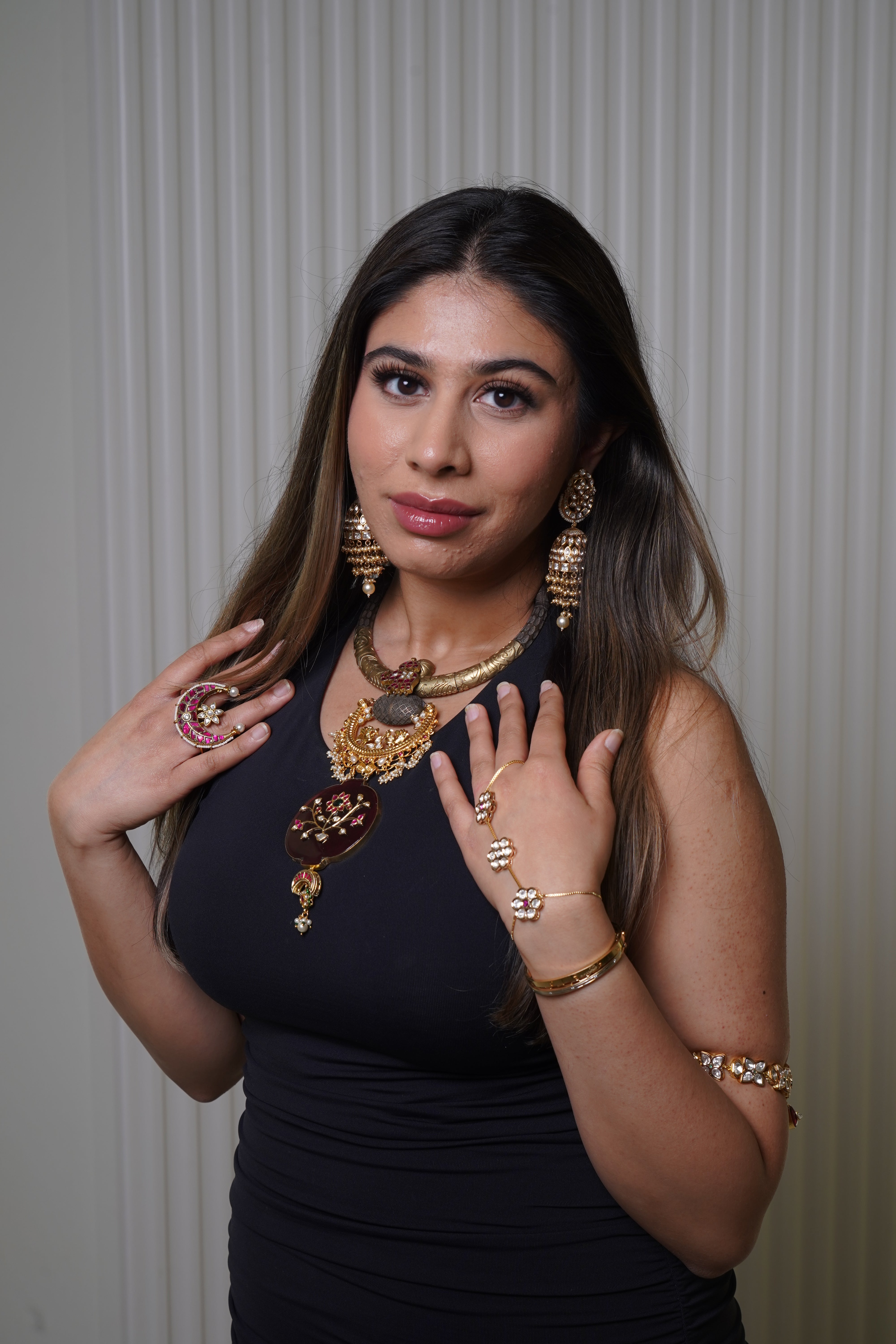 A handcrafted ring with heritage temple motifs, fine kundan detailing, and semi-precious stones, blending tradition with sophistication.