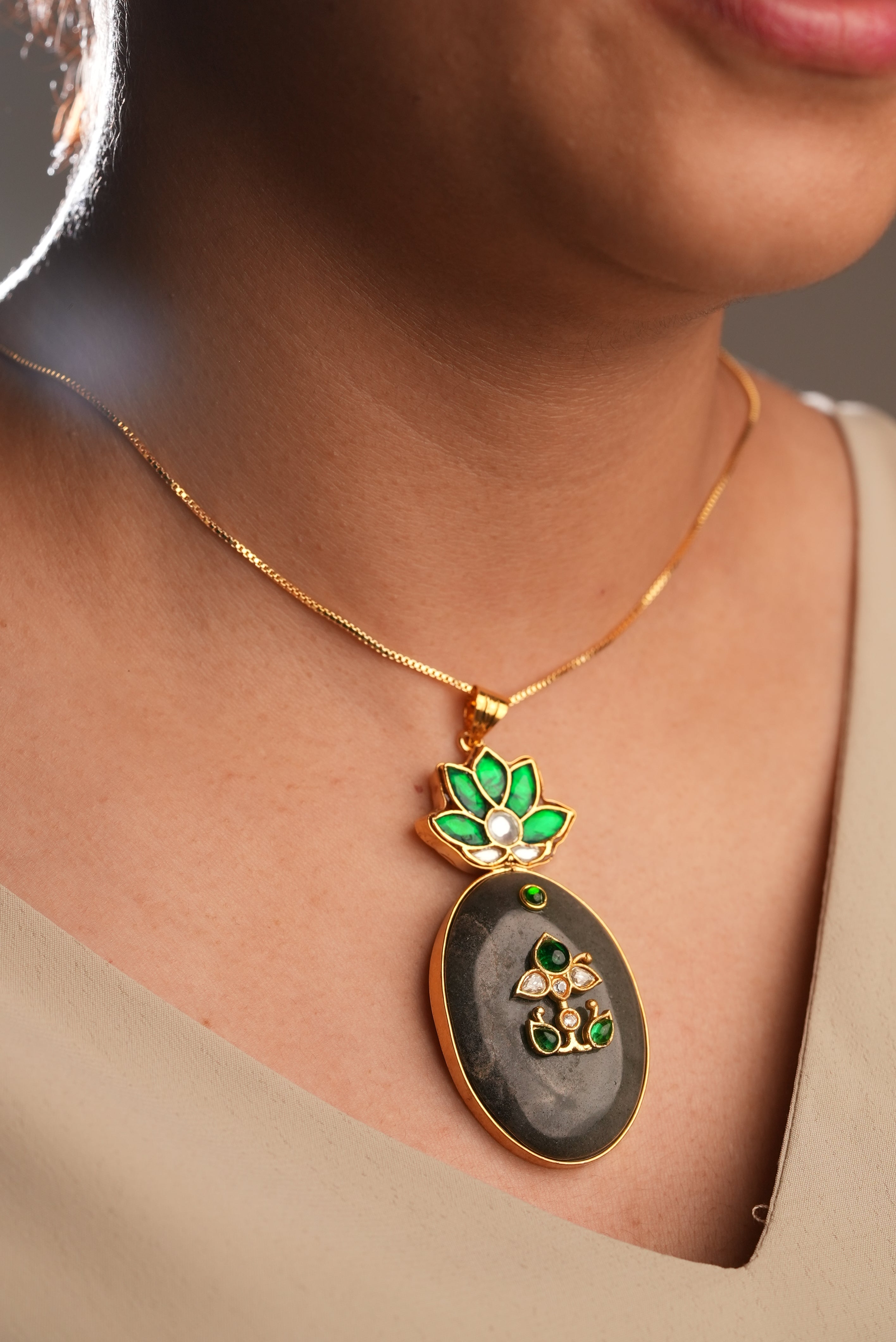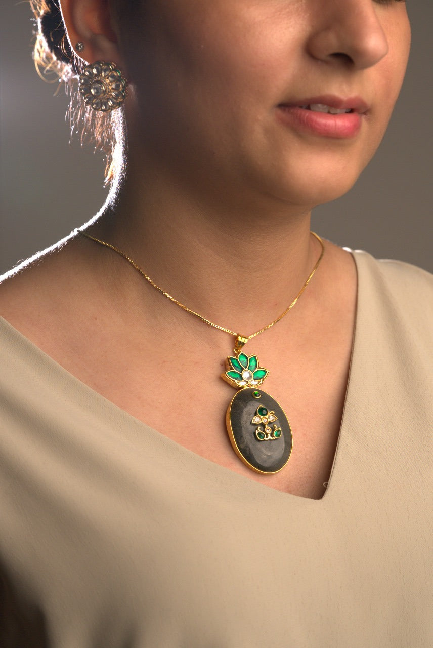Deep Grey and Green Floral Kundan and stone studded chain and pendant