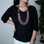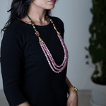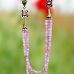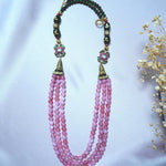 Material: Rose quartz layered necklace with some african brass and temple jewellery inspired kemp pendants on the side