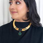 Materials Used: Beautifully designed brass hasli with kundan stones, carved black and green stones