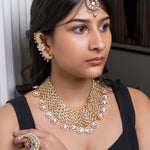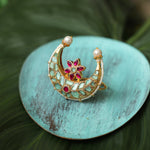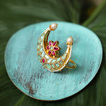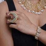A timeless ring featuring intricate kundan work and gemstones adding a touch of elegance to any look.