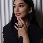 A handcrafted ring with heritage temple motifs, fine kundan detailing, and semi-precious stones, blending tradition with sophistication.