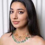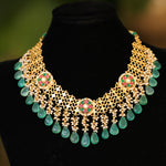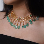 Ethinic golden necklace with green hued kemp stones : Isaana Collection