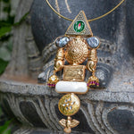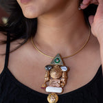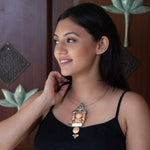 Dimensions: chain 14 cm, pendant 12.25cm, total 24.5 cm Weight: 35.83 Gms  Length: fixed Materials Used: brass with semi-precious stones, Kundan, mother of pearls        Please note: There may be a slight variation in the product image & actual product with regards to stone colors and very slight shape differences as it is handmade.