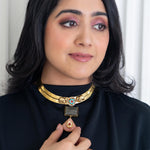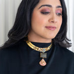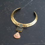 Intricately designed elephants on a brass hasli with a rectangular cut labradorite and rose quartz