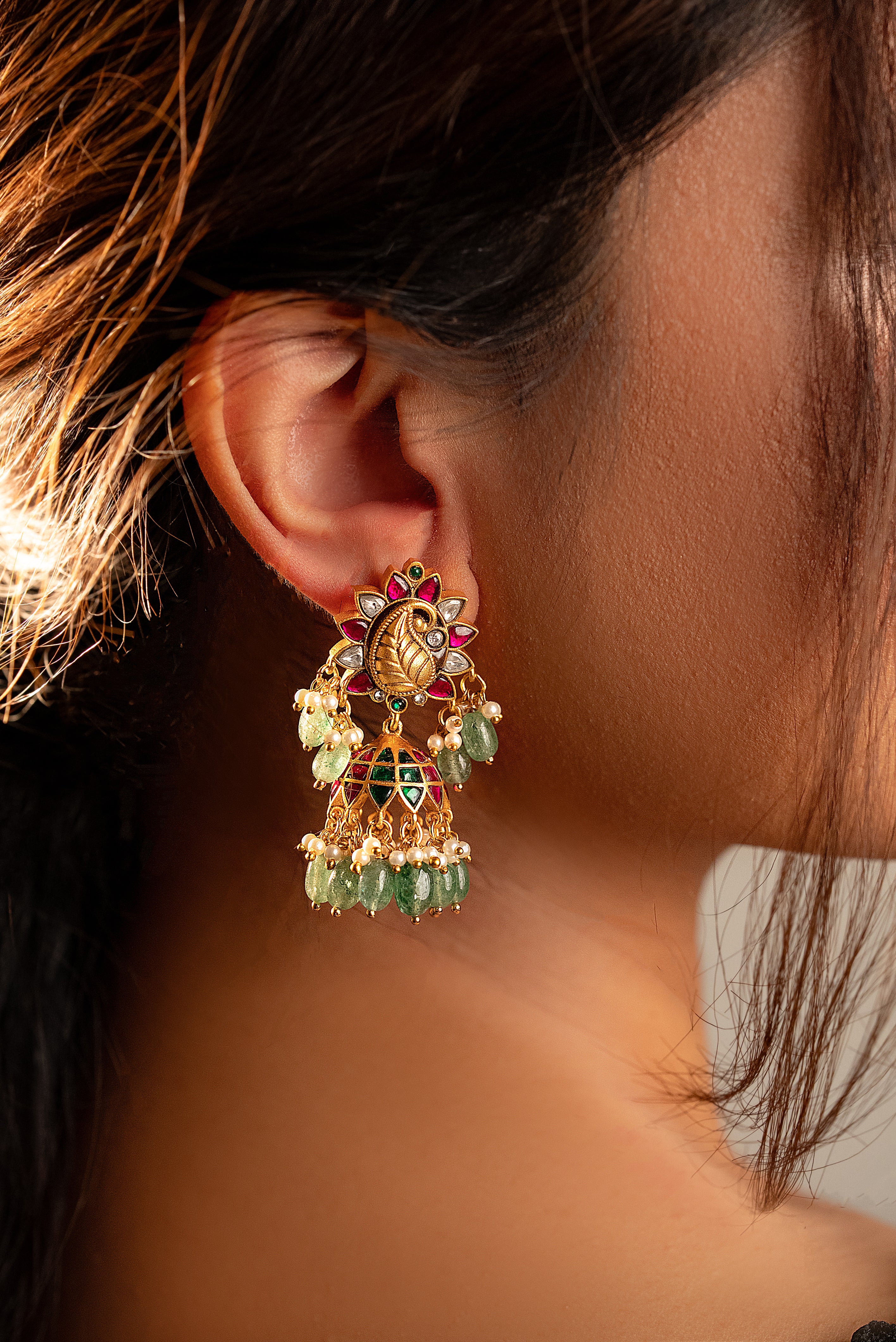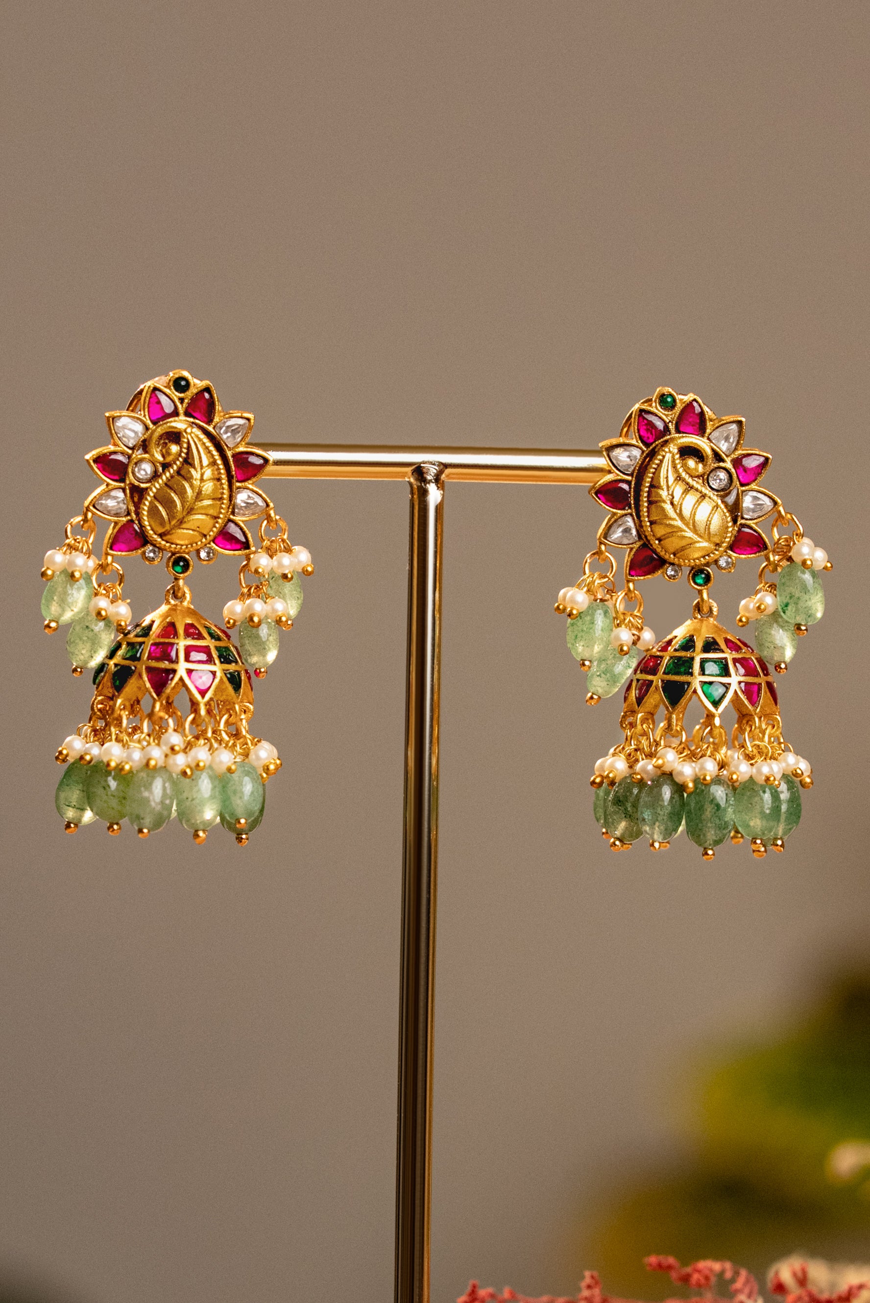 Majestic Jhumka with Kundan & Green Semi-precious stone Drop Design