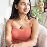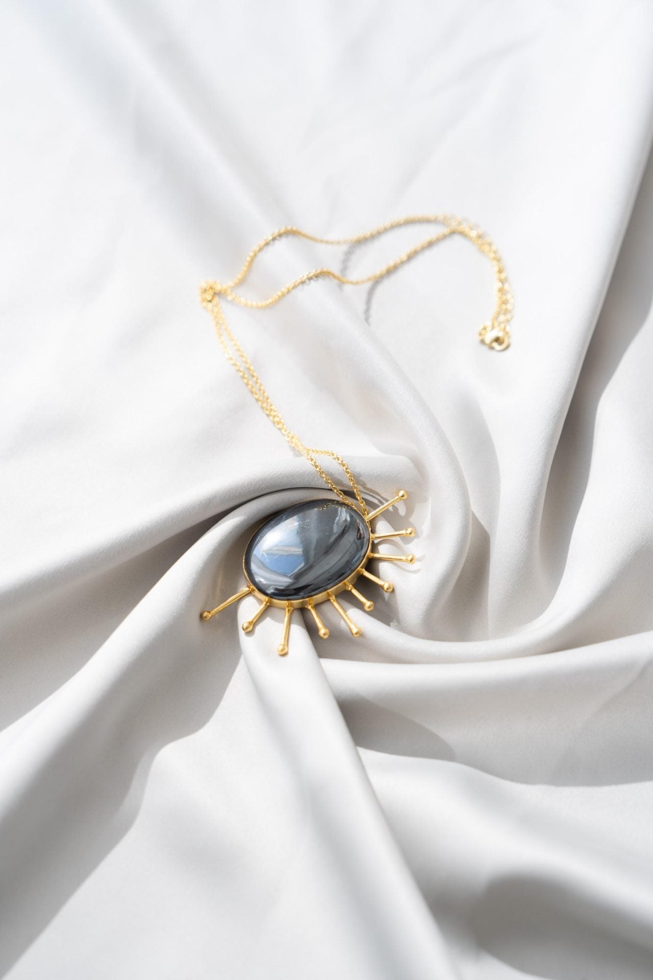 Weight: 24 Gms Dimensions: 31 Cms Materials Used: Iron Tiger Eye pendant with gold spikes design. Strung on delicate gold-plated chain. Healing Properties: Iron Tiger Eye is a composition of two stones, Tiger eye, and Hematite. This stone grants you vigor and strength. It helps to balance your emotions and keeps you grounded.