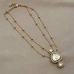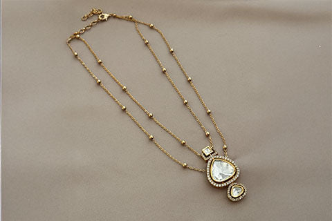 Sleek, double-layered design featuring moozanite polki stones and sparkling signity stones, set on a gold-plated chain beaded in white pearls with elegant earrings featuring moozanite polki stones