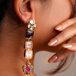 Earrings curated with semi-precious stones and inspired by tropical flora and fauna. brass with gold plating gemstones,anti-tarnish nickel-free metal ( copper base mostly) with 1gm gold.
