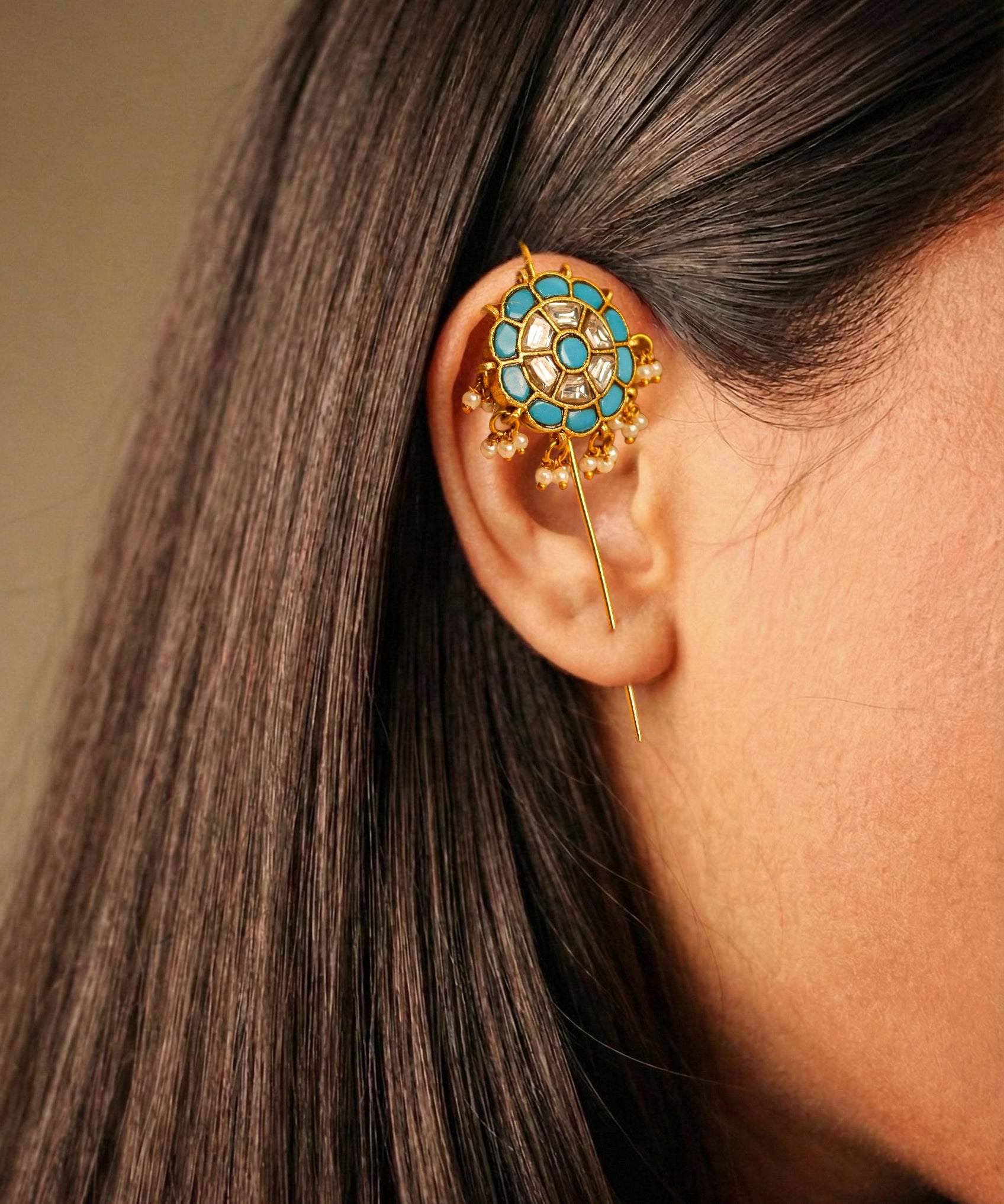 Heritage Turquoise Kundan Flower Earcuff with Dangling Perals