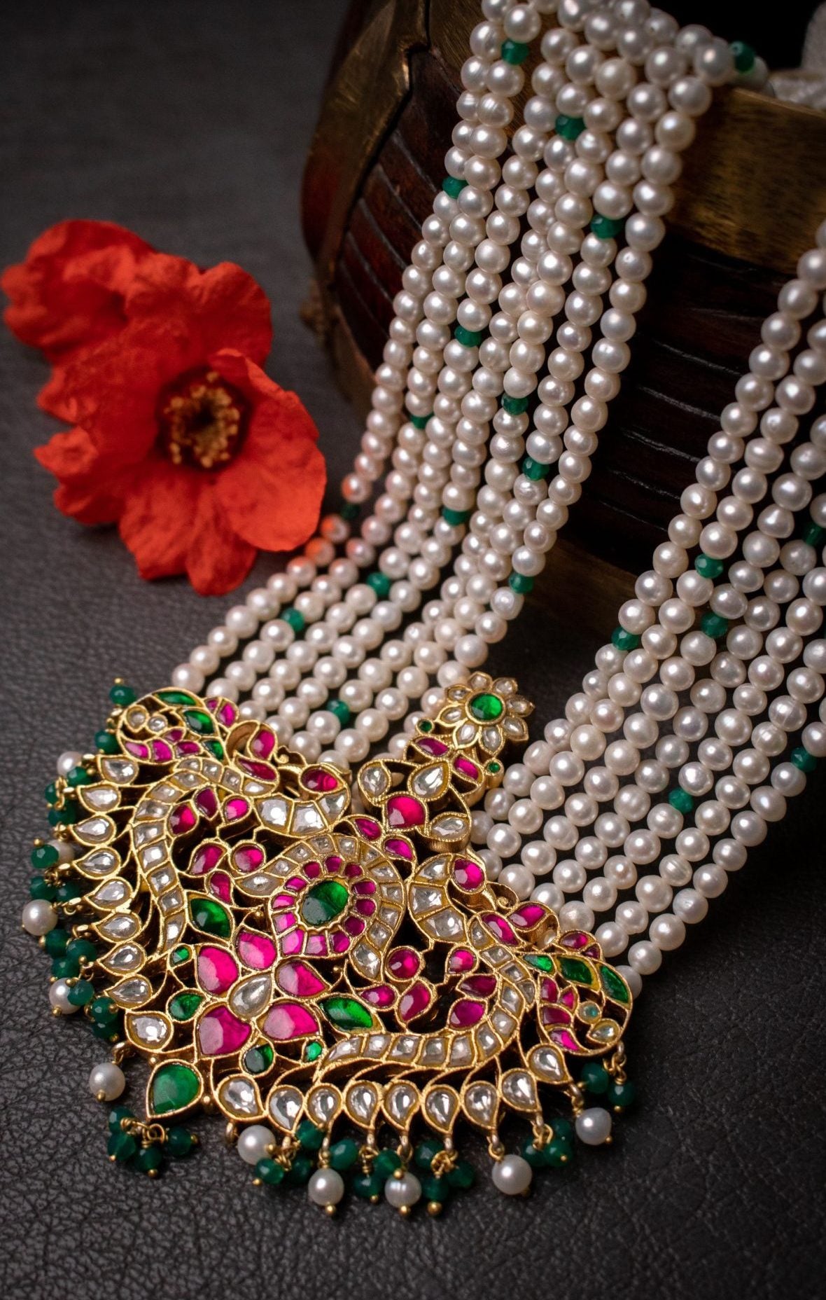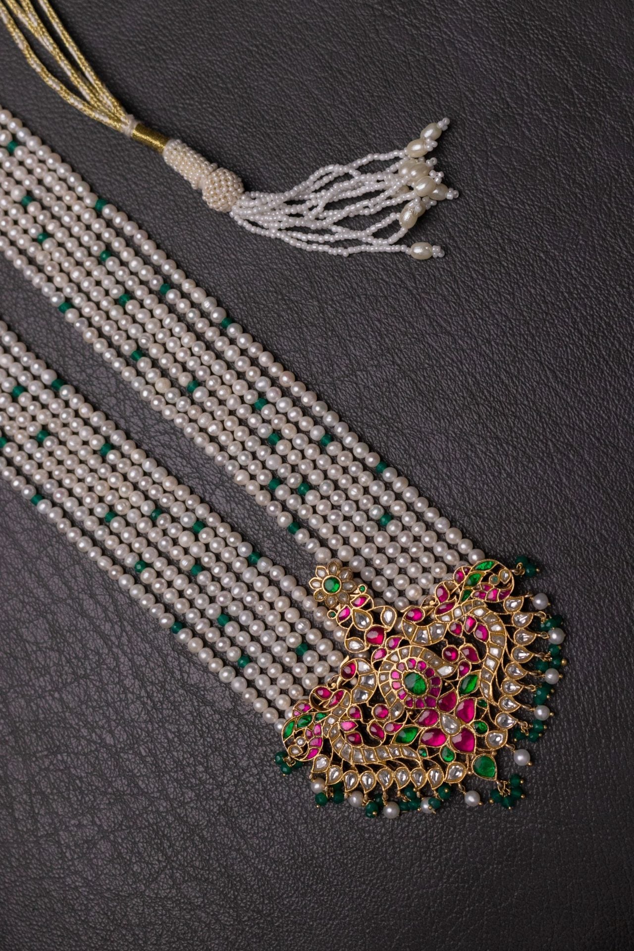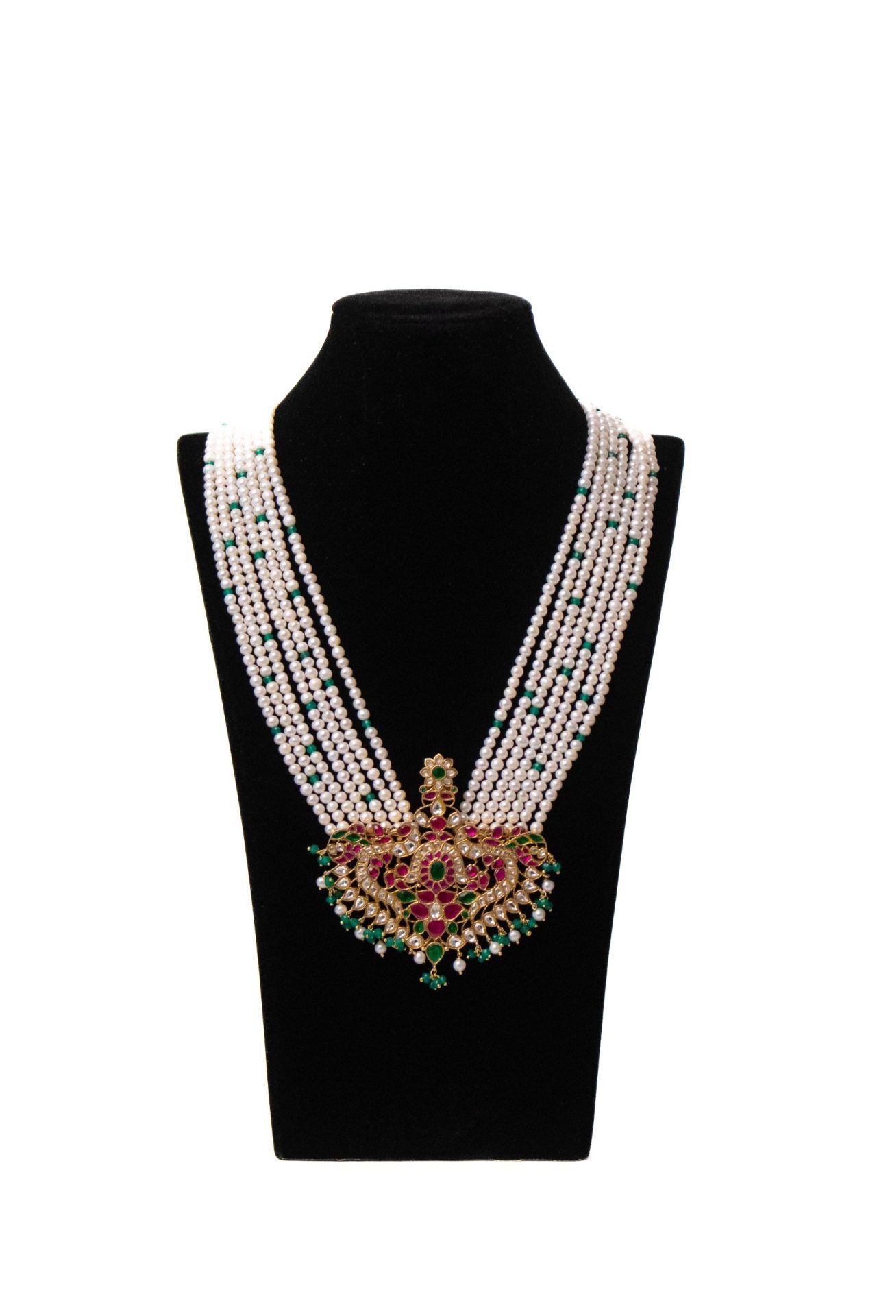Weight: 122 Gms Dimensions: 48 Cms Materials Used: Gold polished Silver pendant with green/red and whiter kemp stones and pearls
