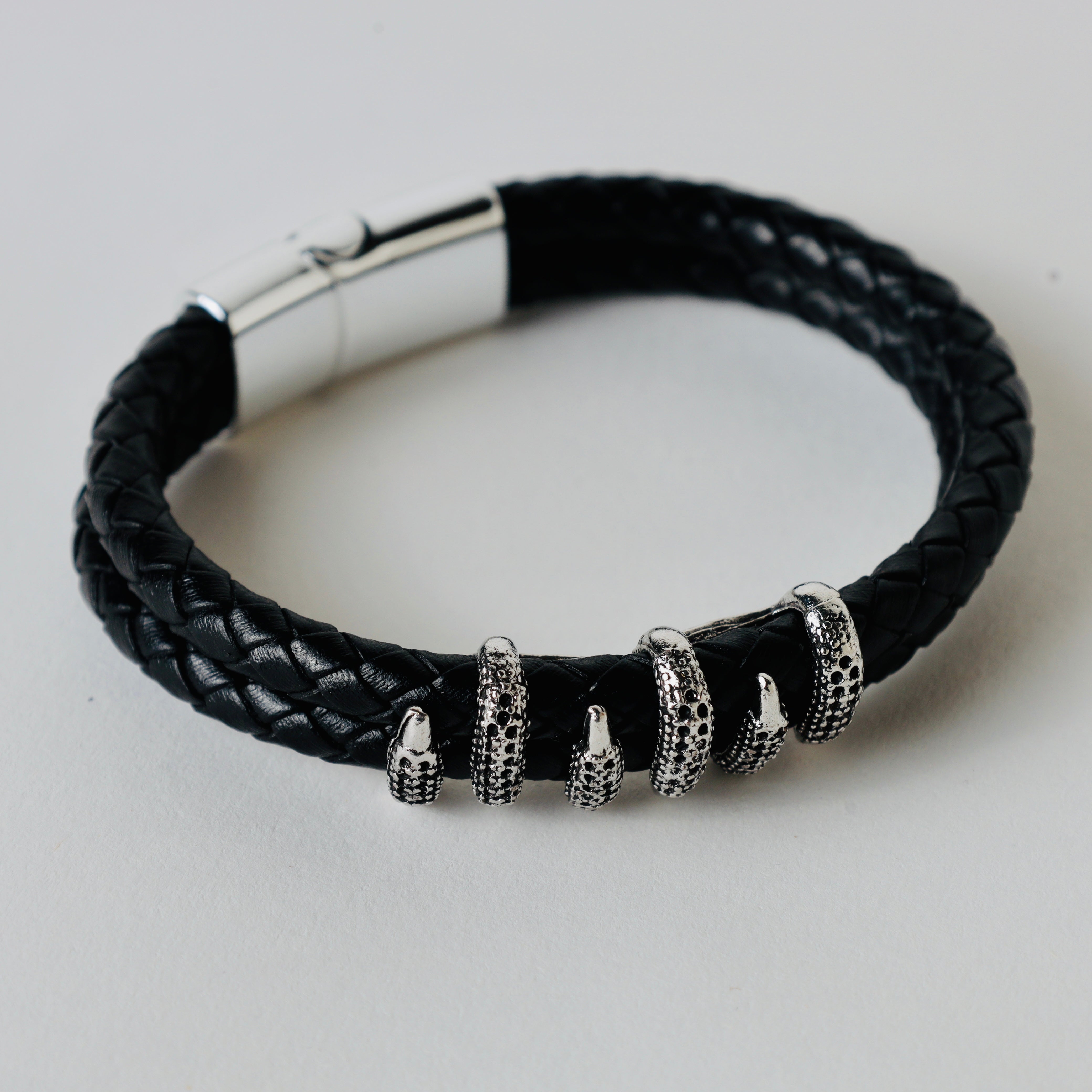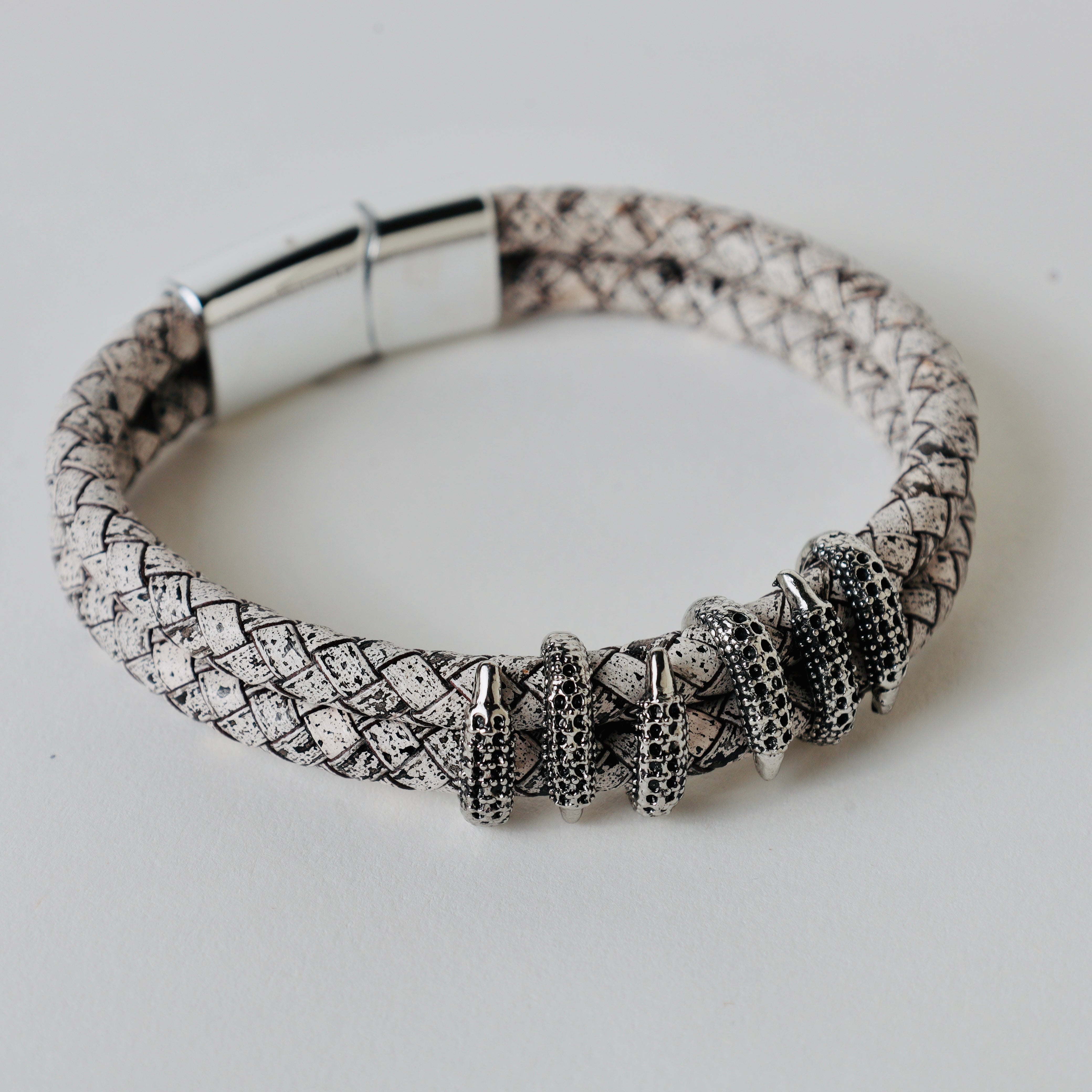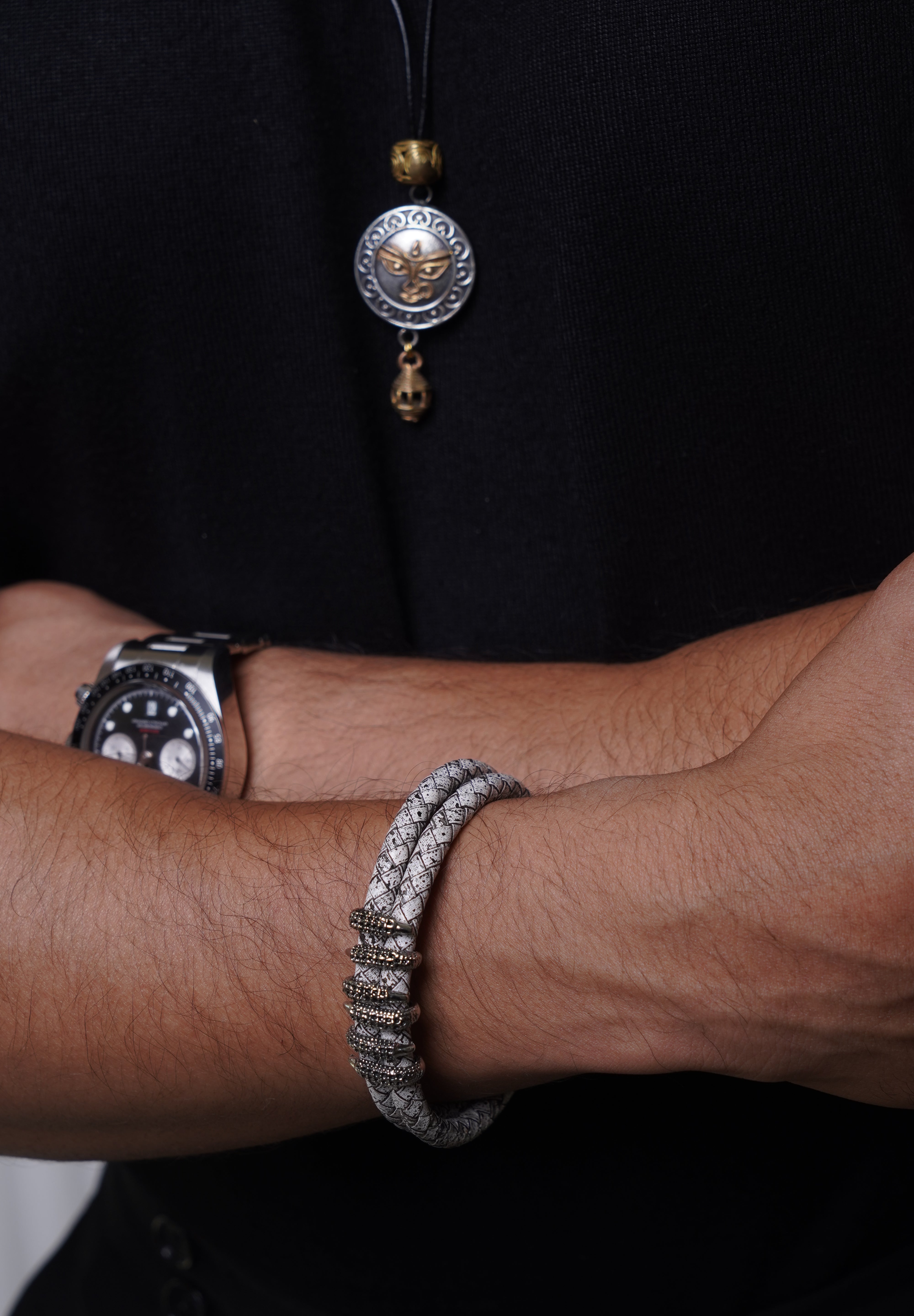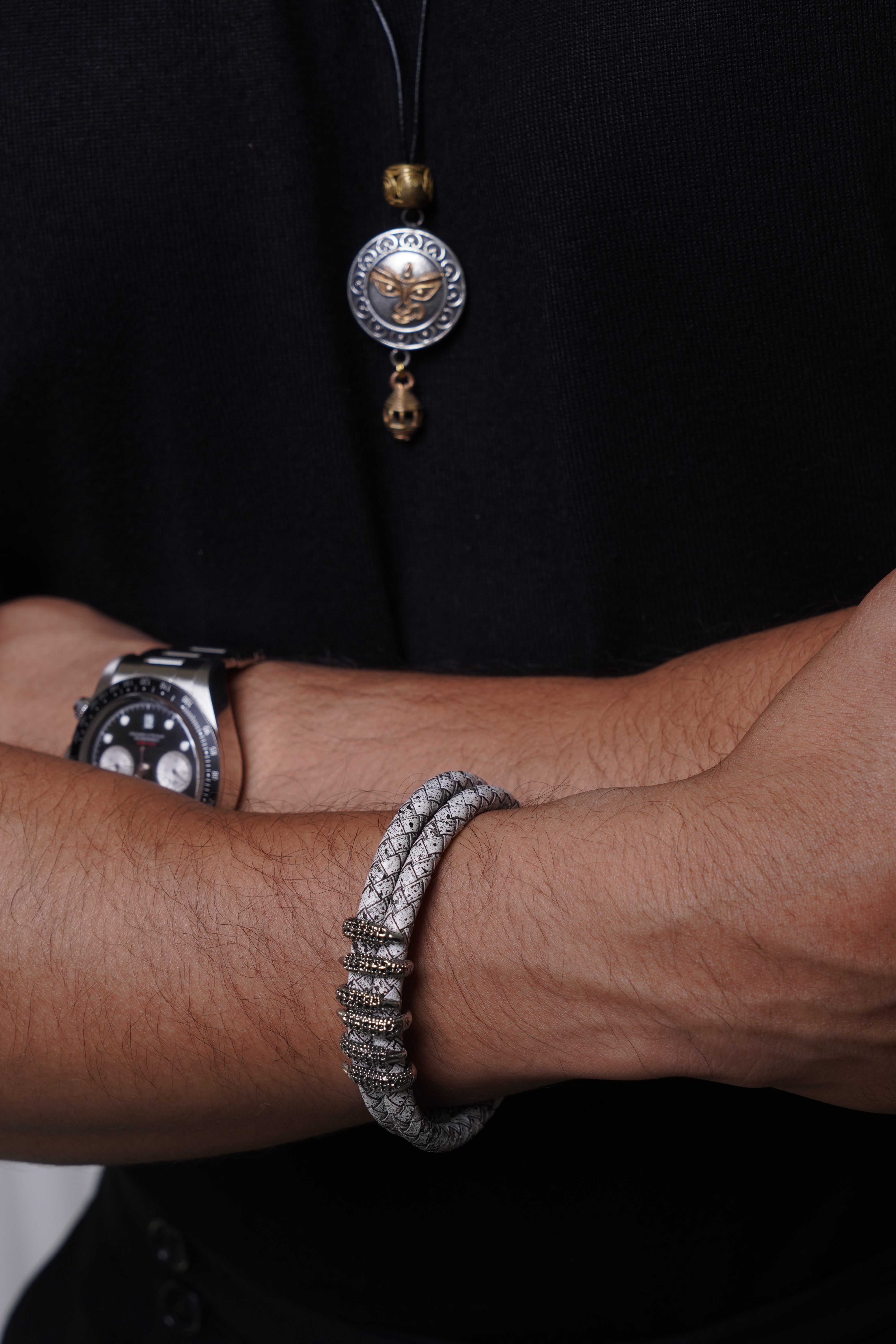 Black leather braided strap with silver and gold color embellishment