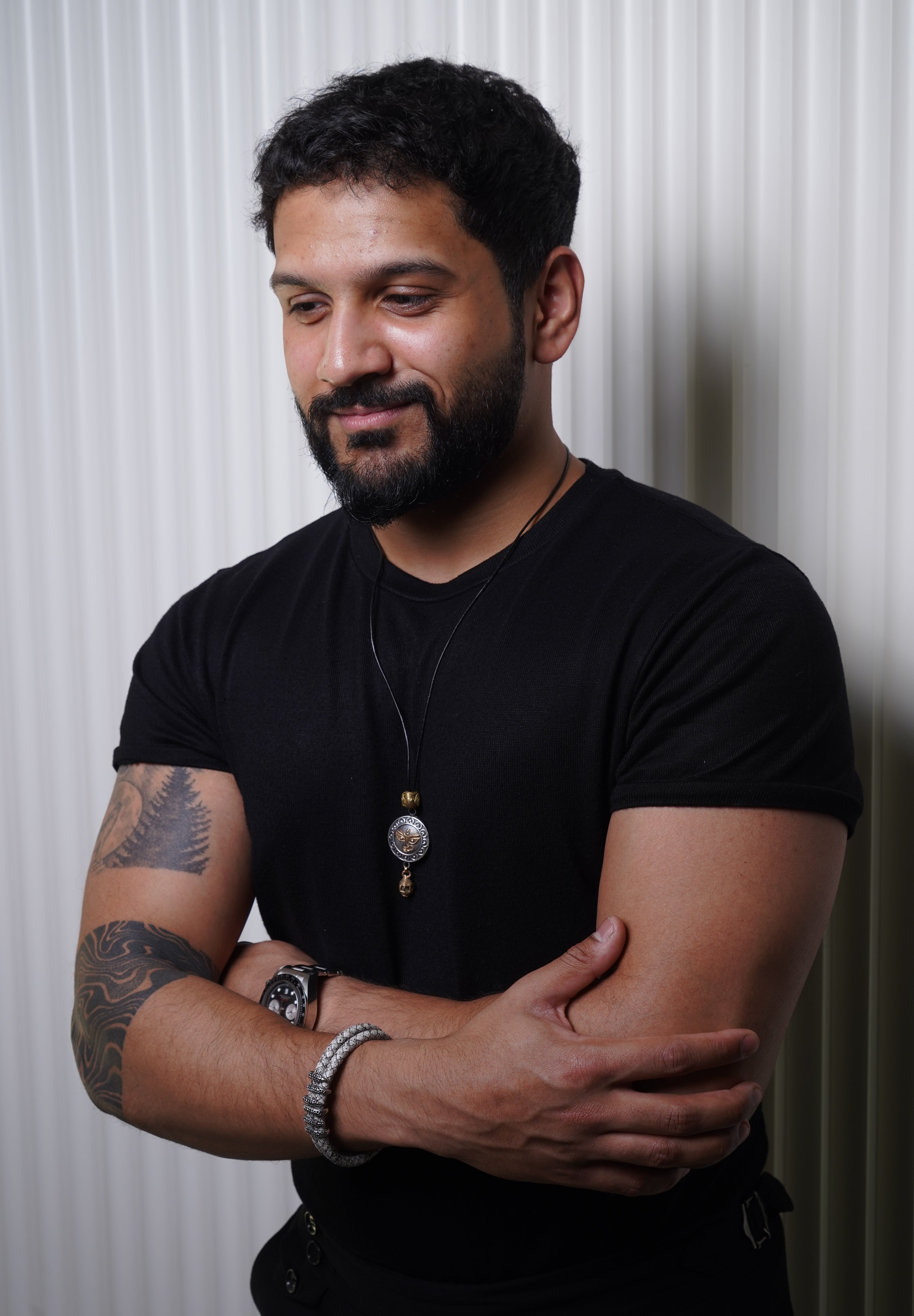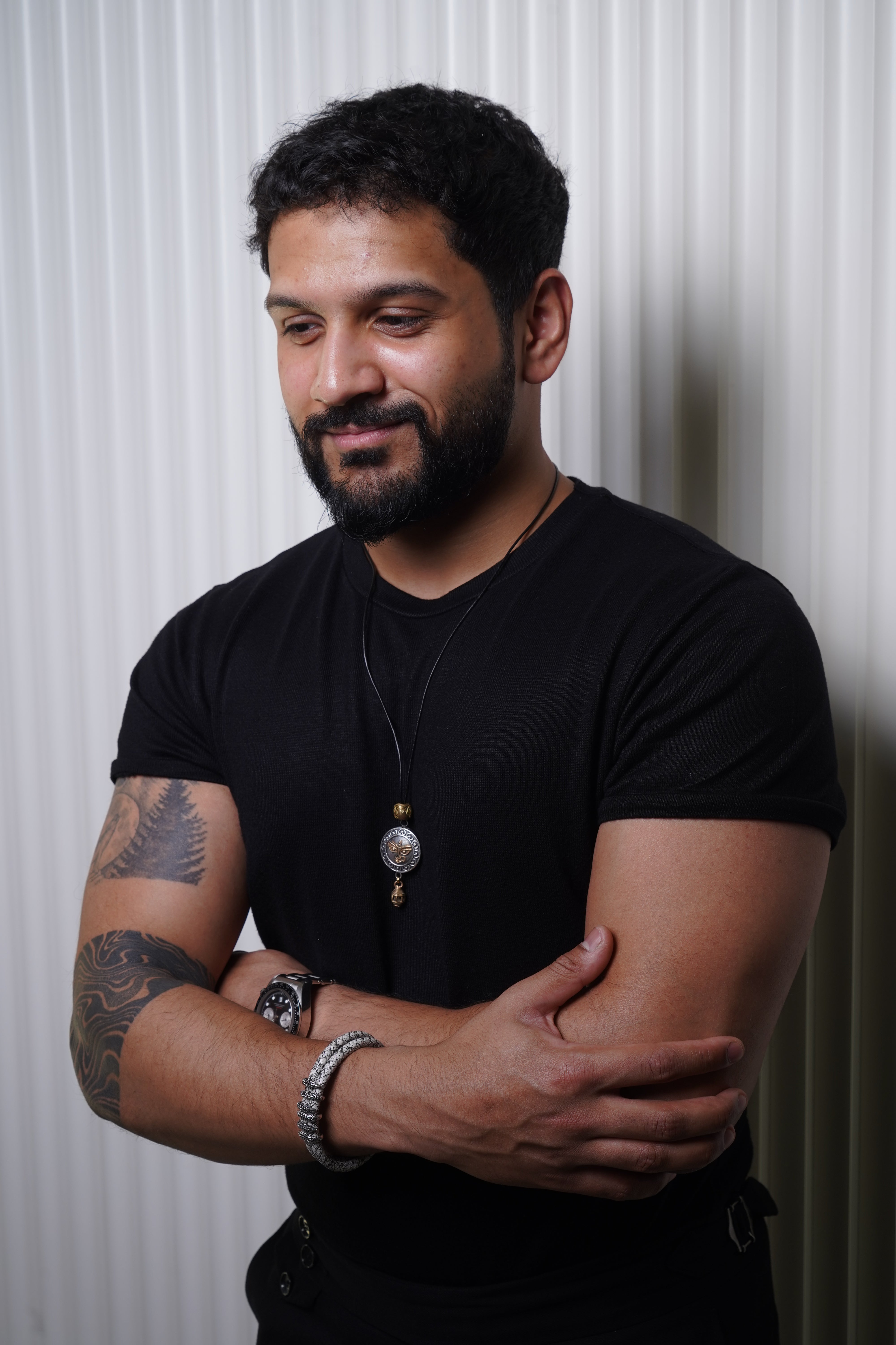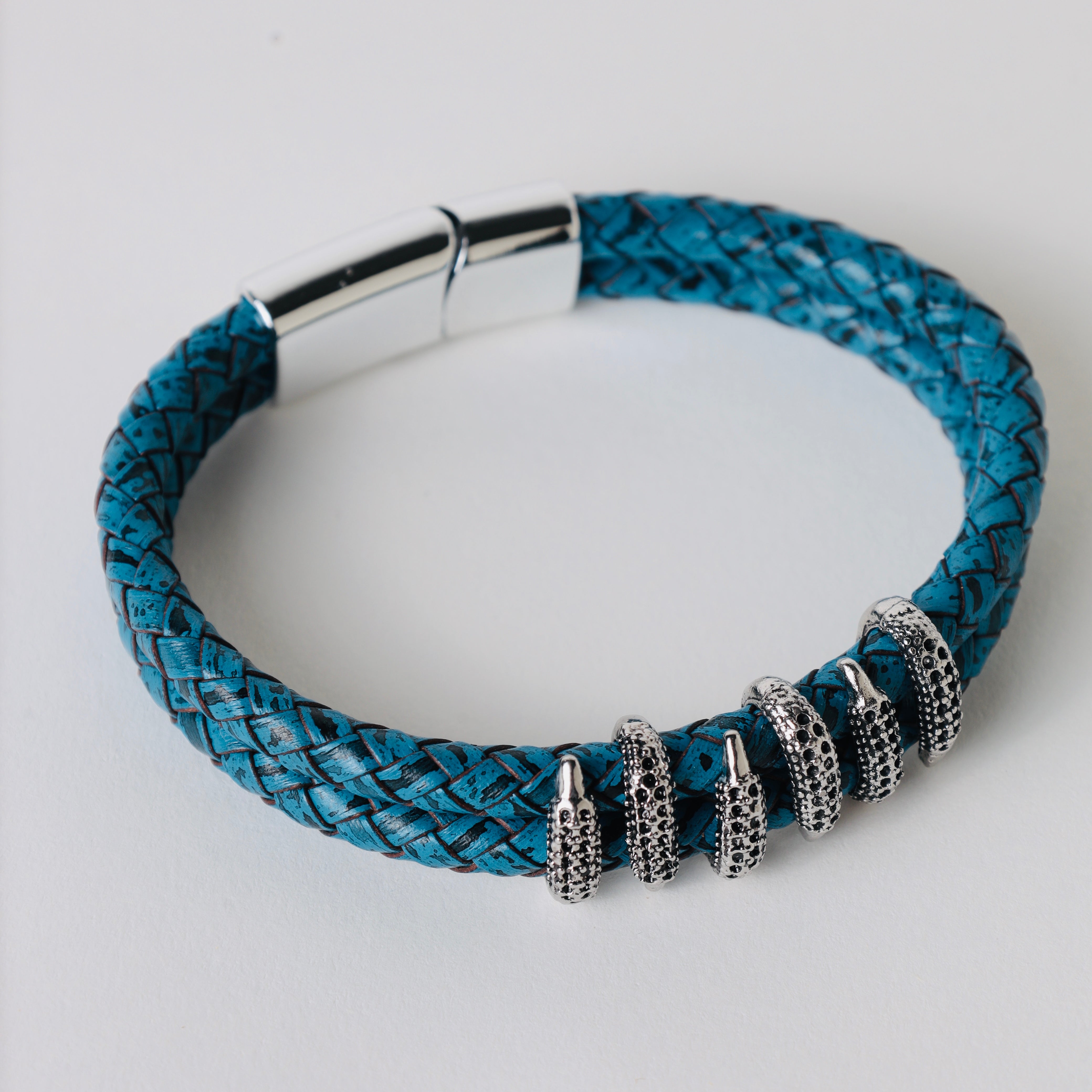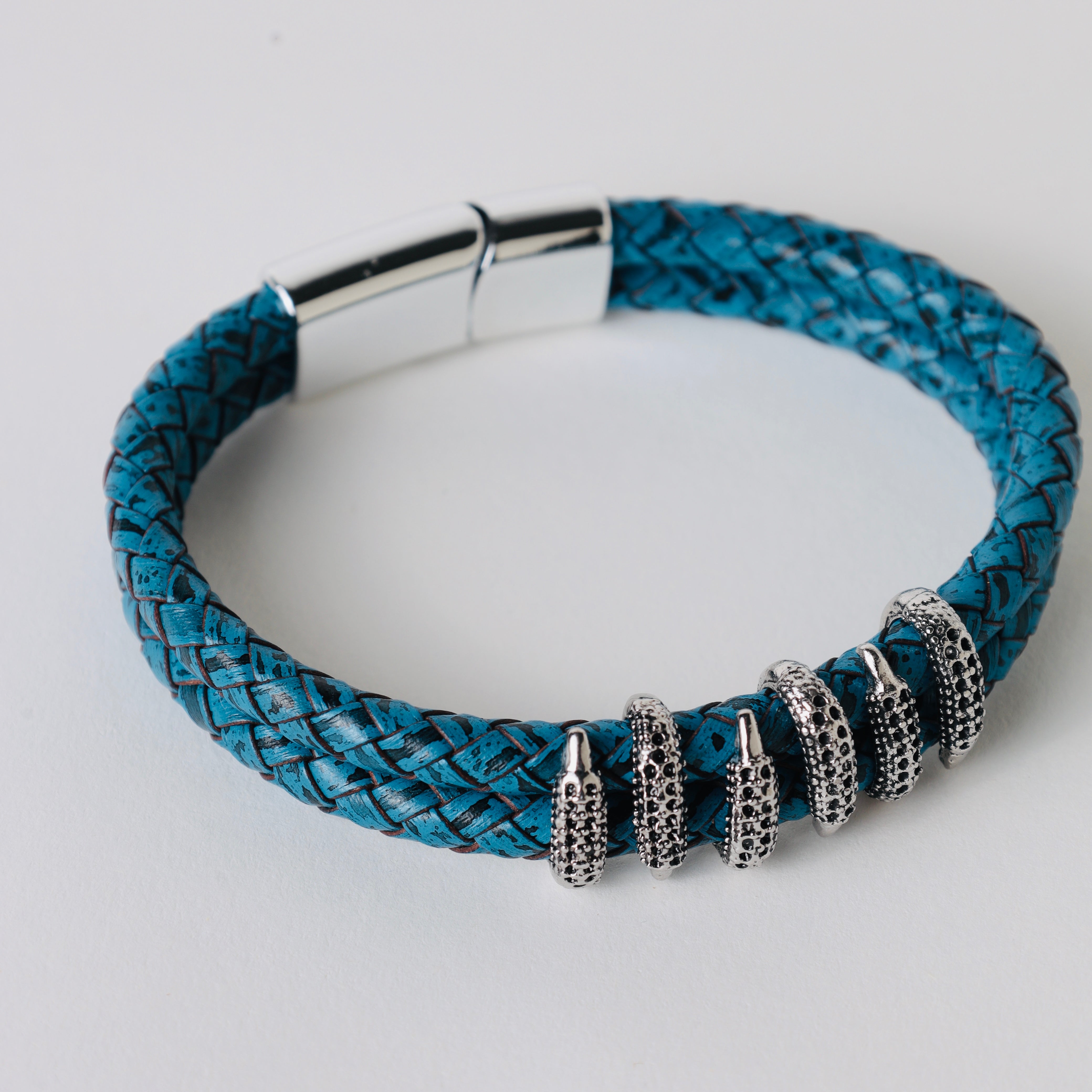 Black leather braided strap with silver and gold color embellishment