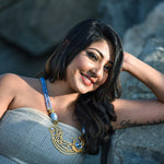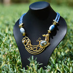 Statement necklace paired with blue crystals and Baroque pearls