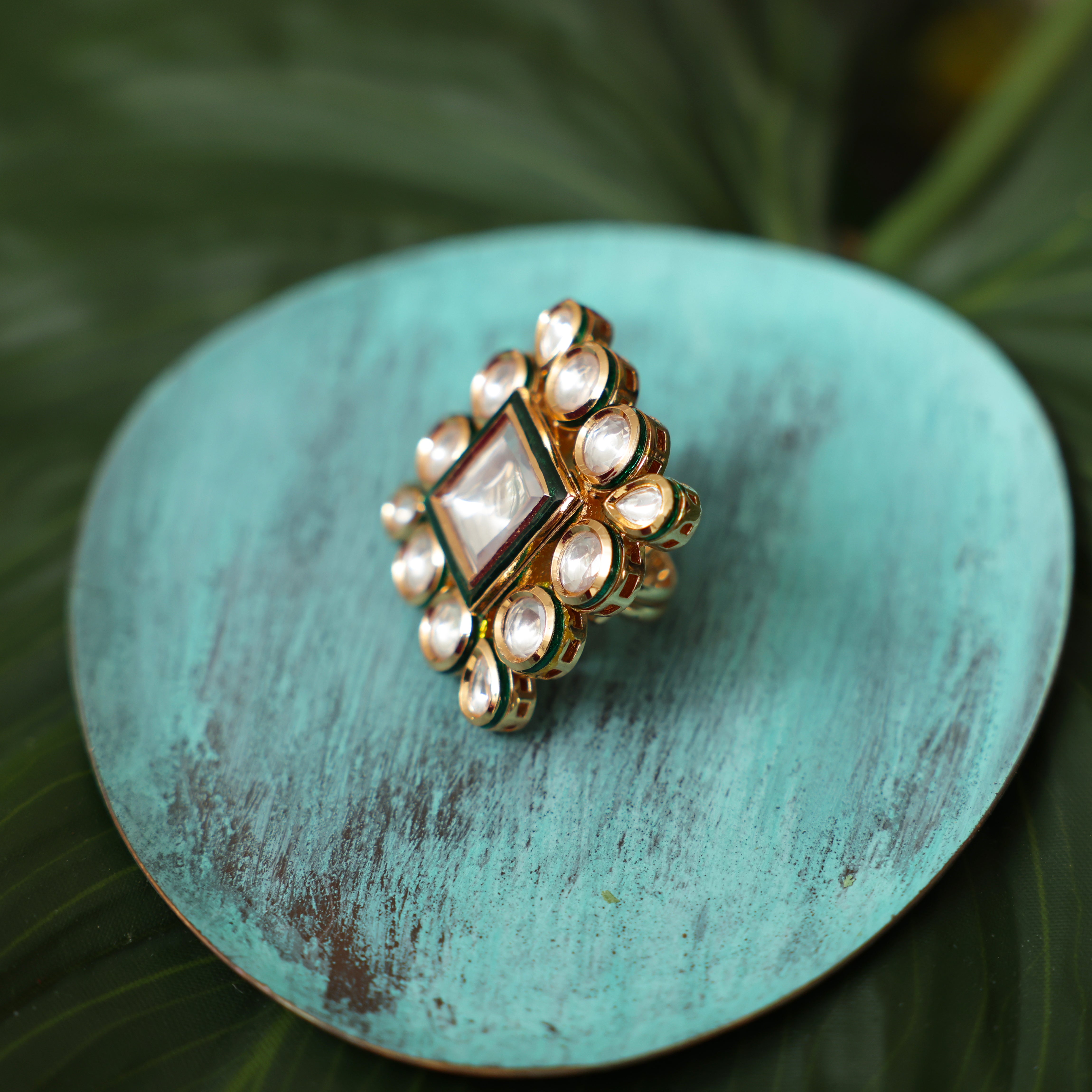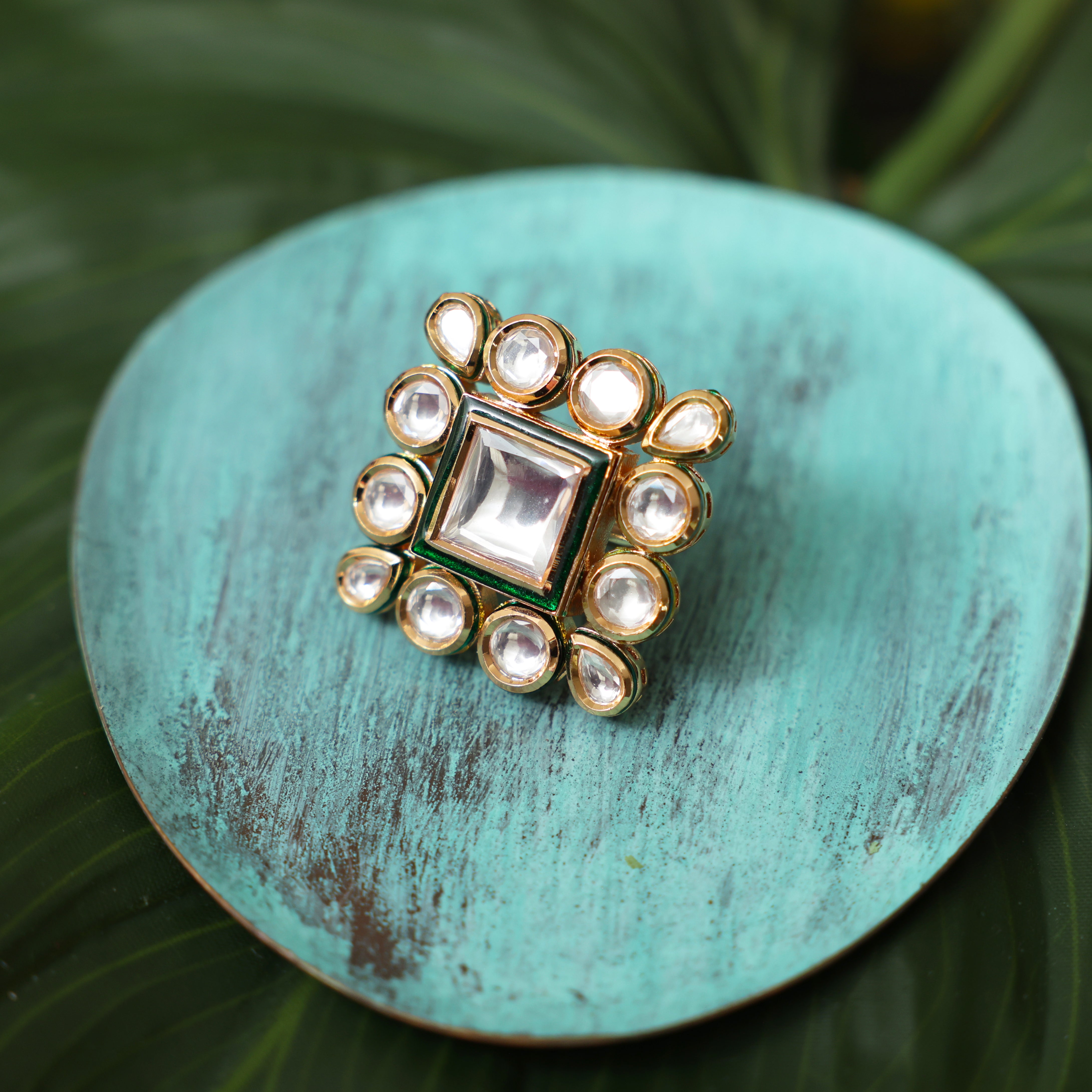 A bold and statement design with semi-precious Ruby stones with intricate craftsmanship, designed to make an impression. White kundan and 1 gm gold ring