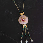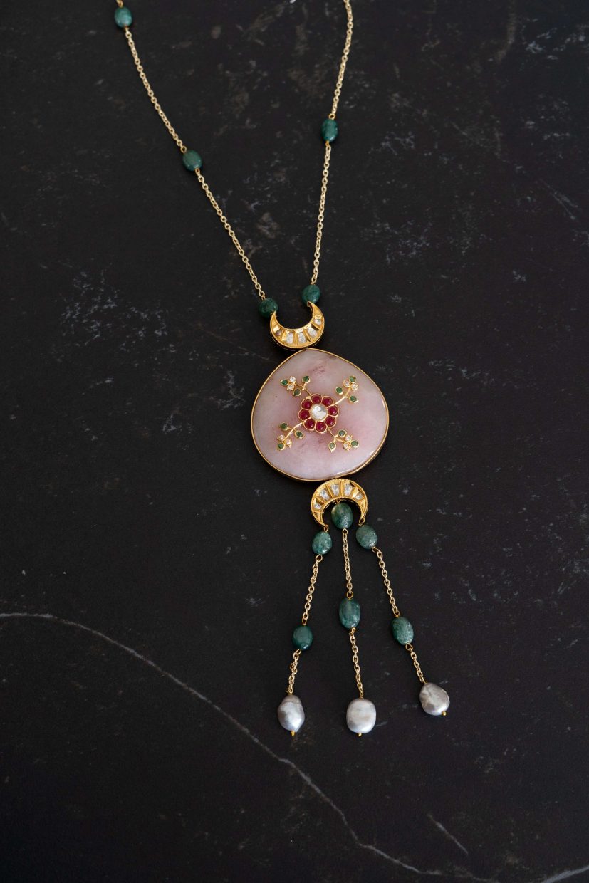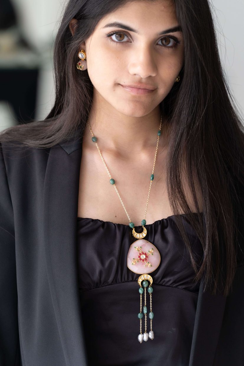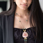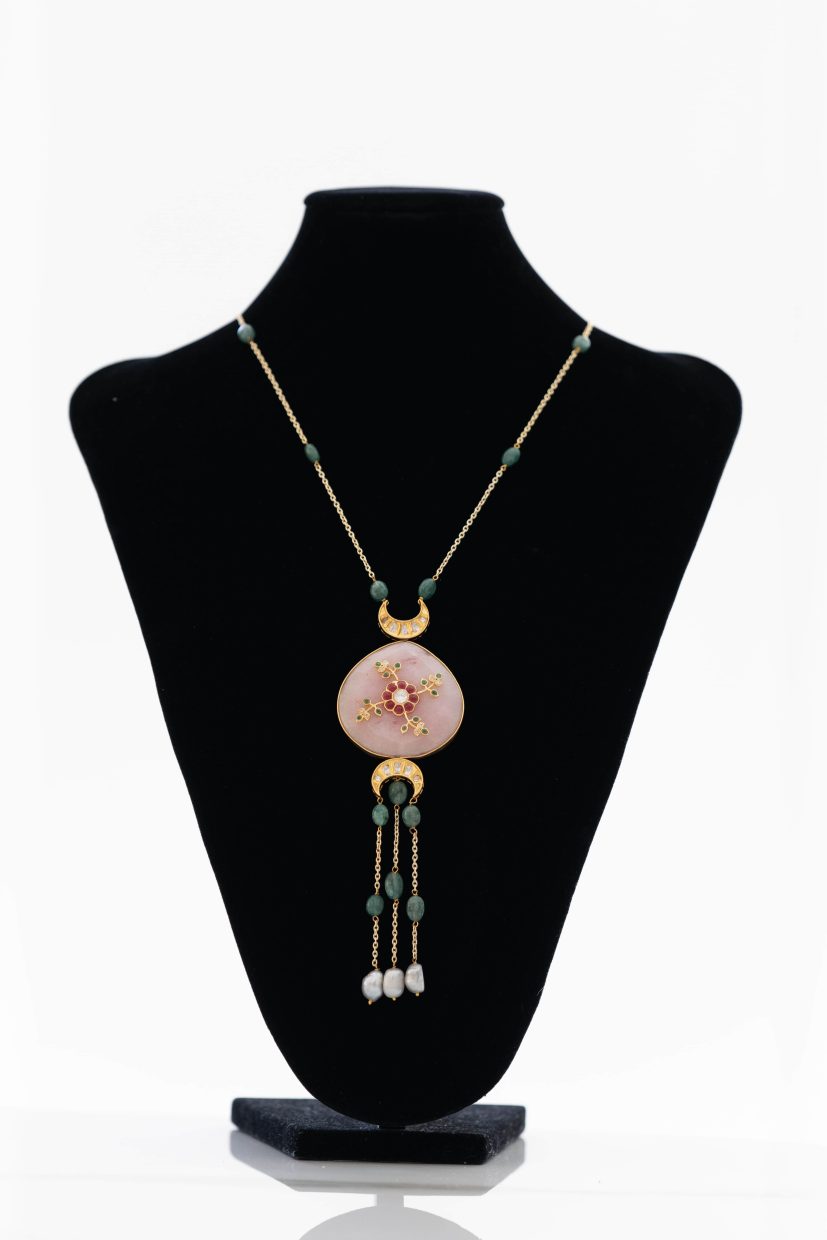 Rose quartz and Kundan pendant paired with Amozonite beads