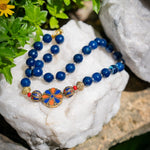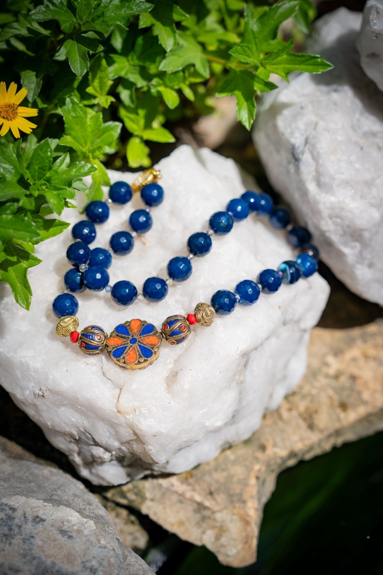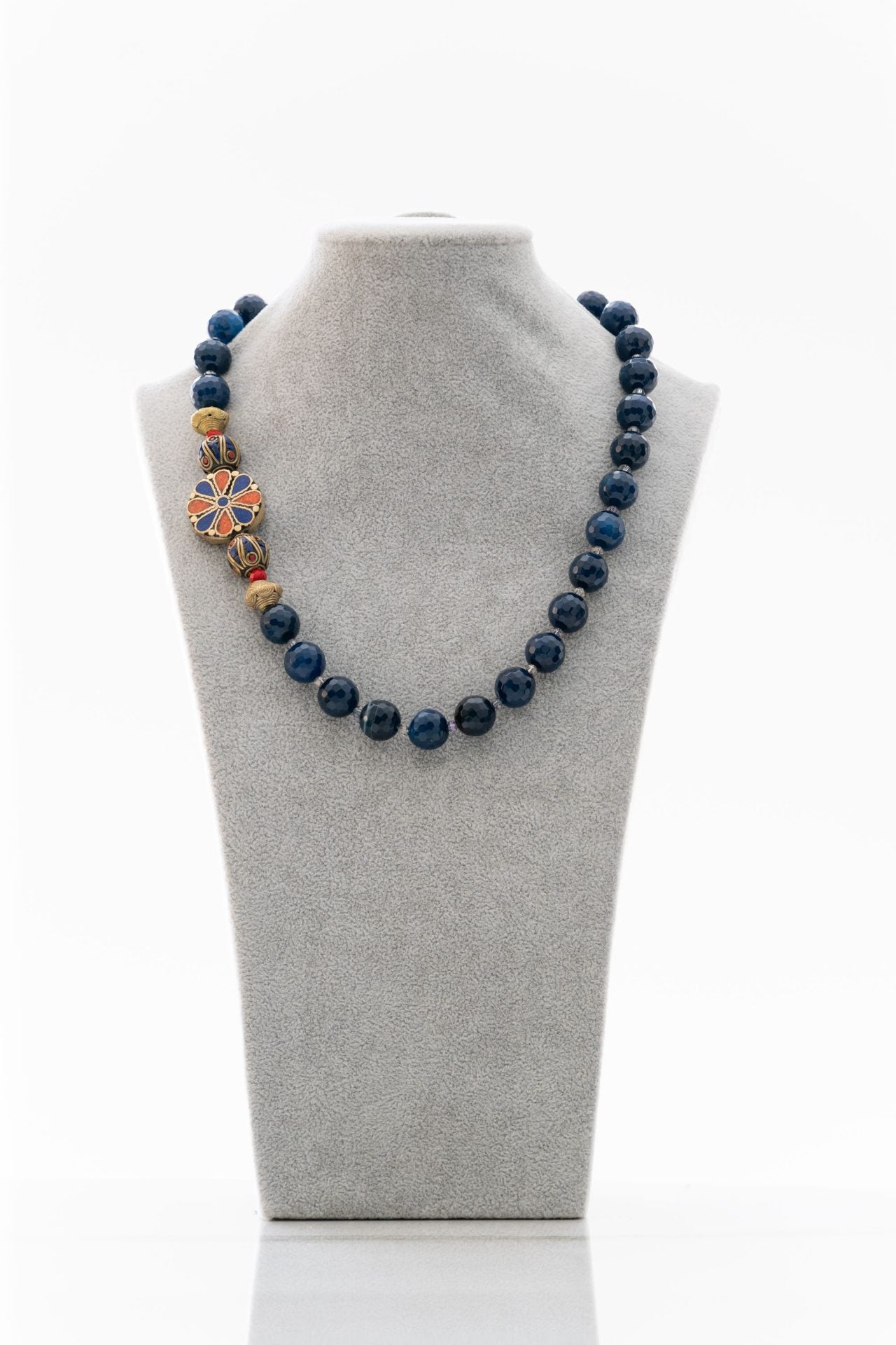 Signature beaded necklace with Tibetan side pendant and blue crystals