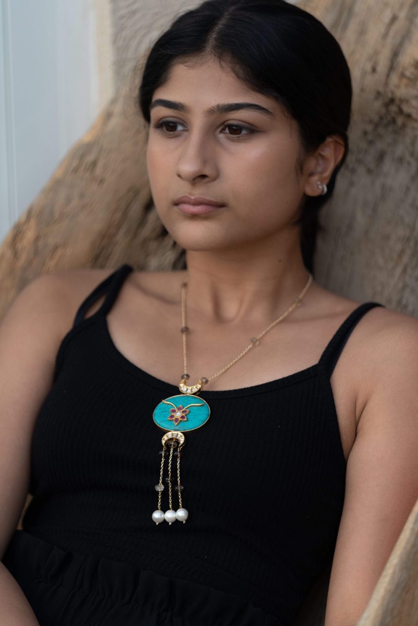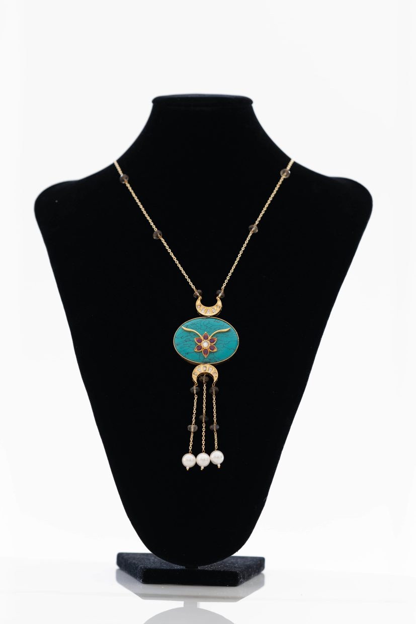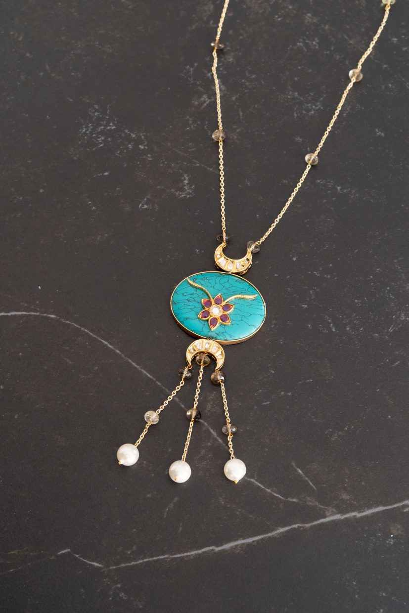 Turquoise kundan pendant paired with green fluroite & pearl beads