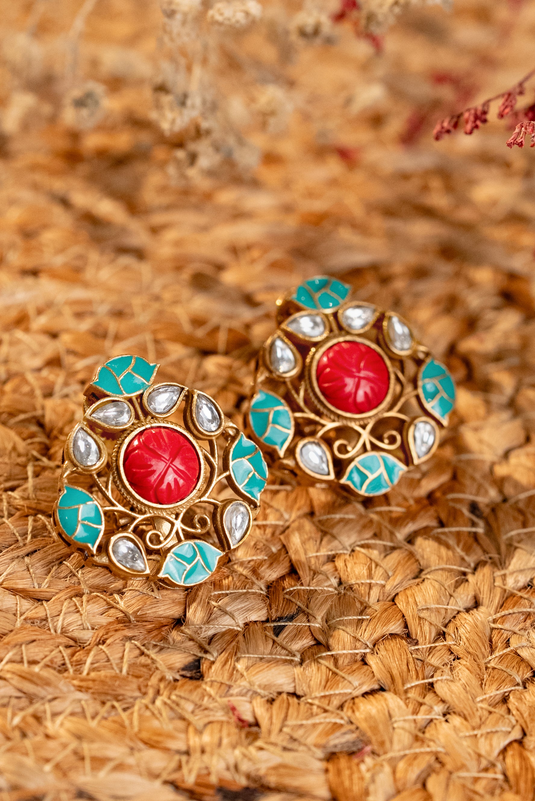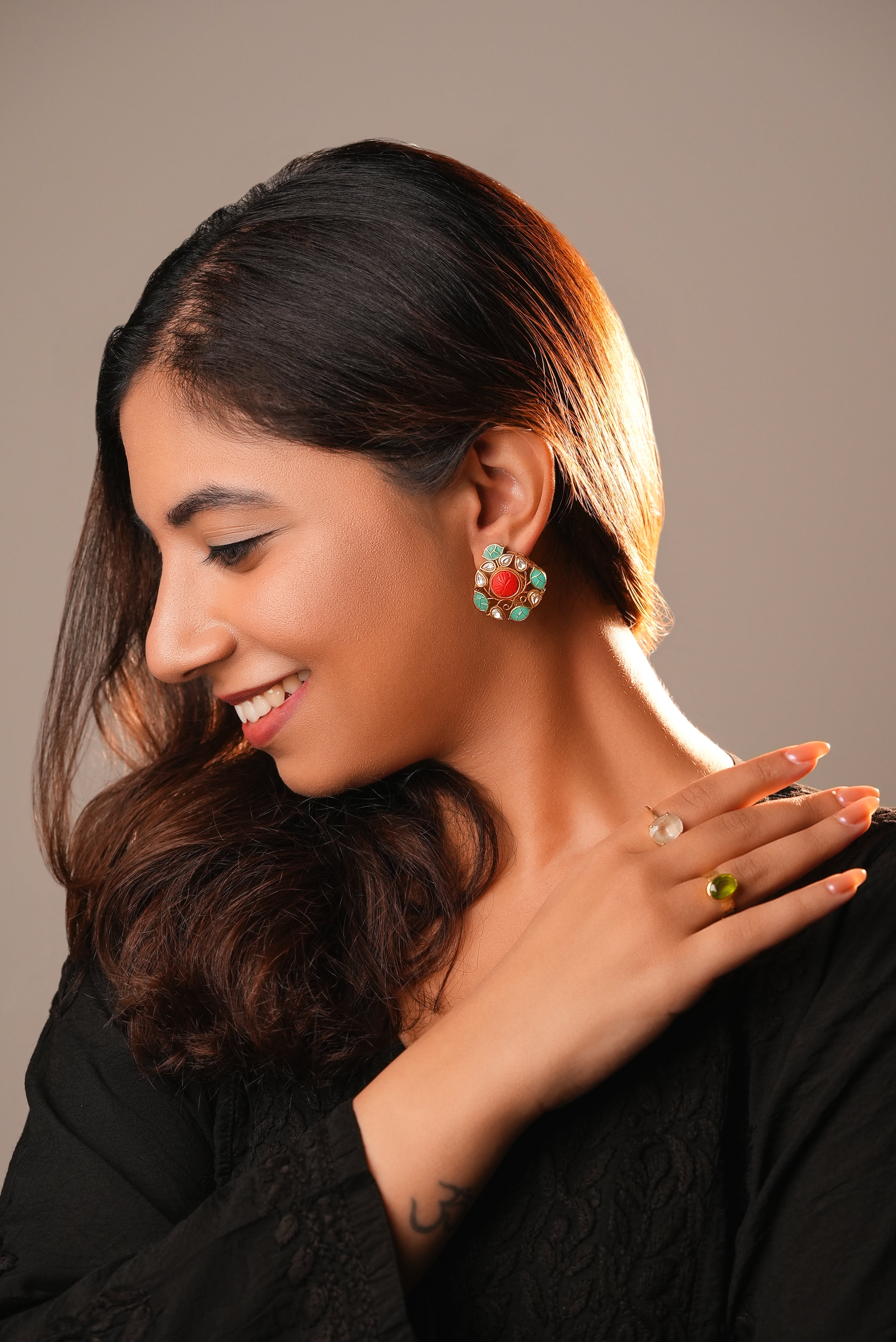 Majestic fusion earrings with Turquoise and Coral Red Stone- Fiza Collection