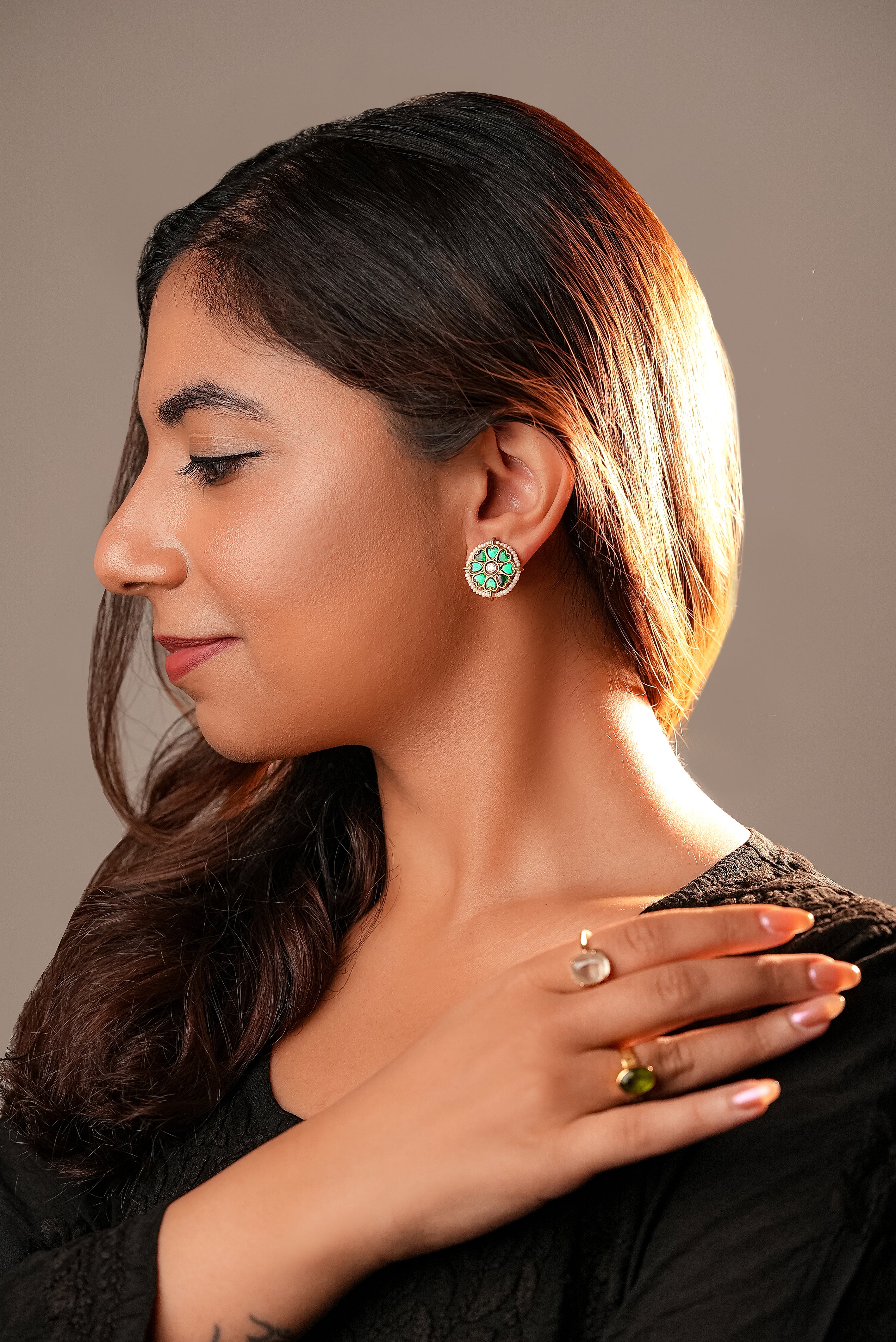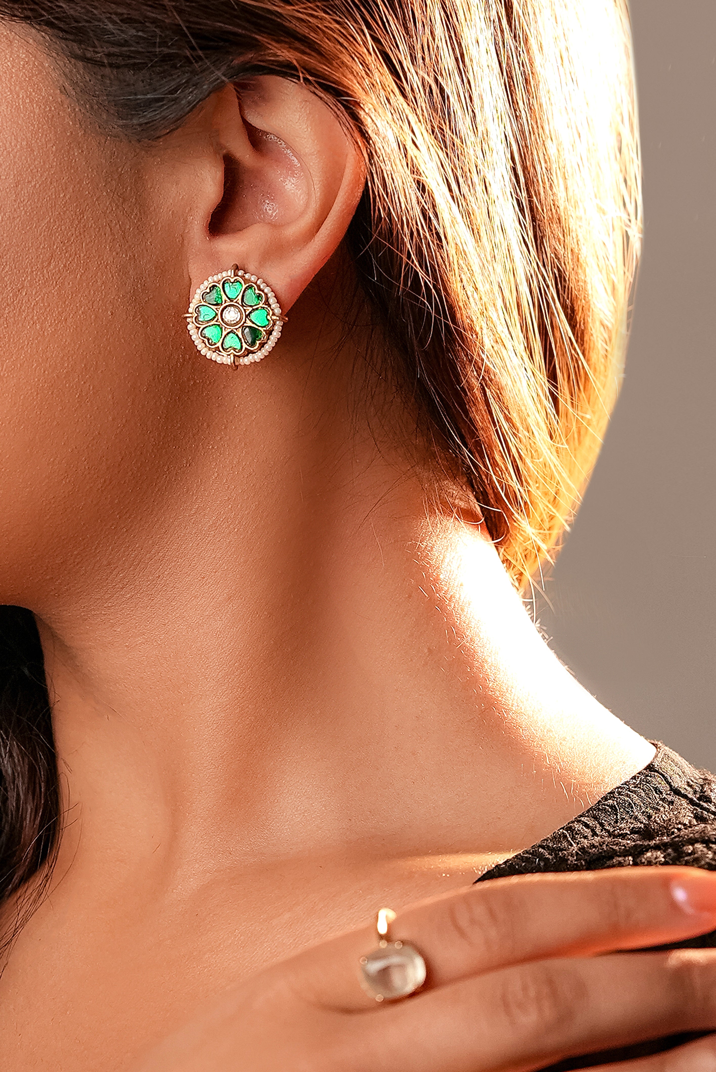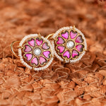 with round earrings with moozanite polki stones and sparkling