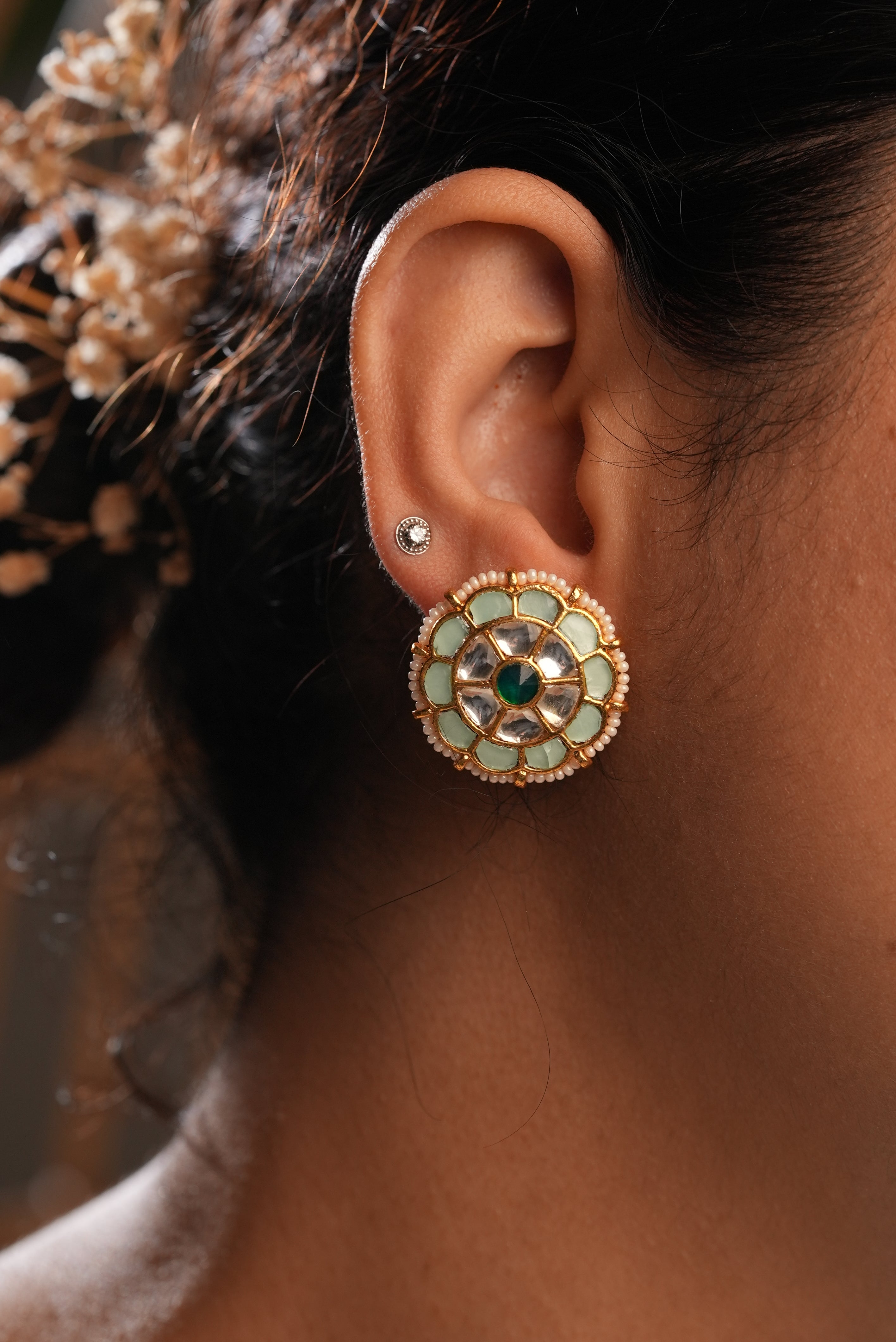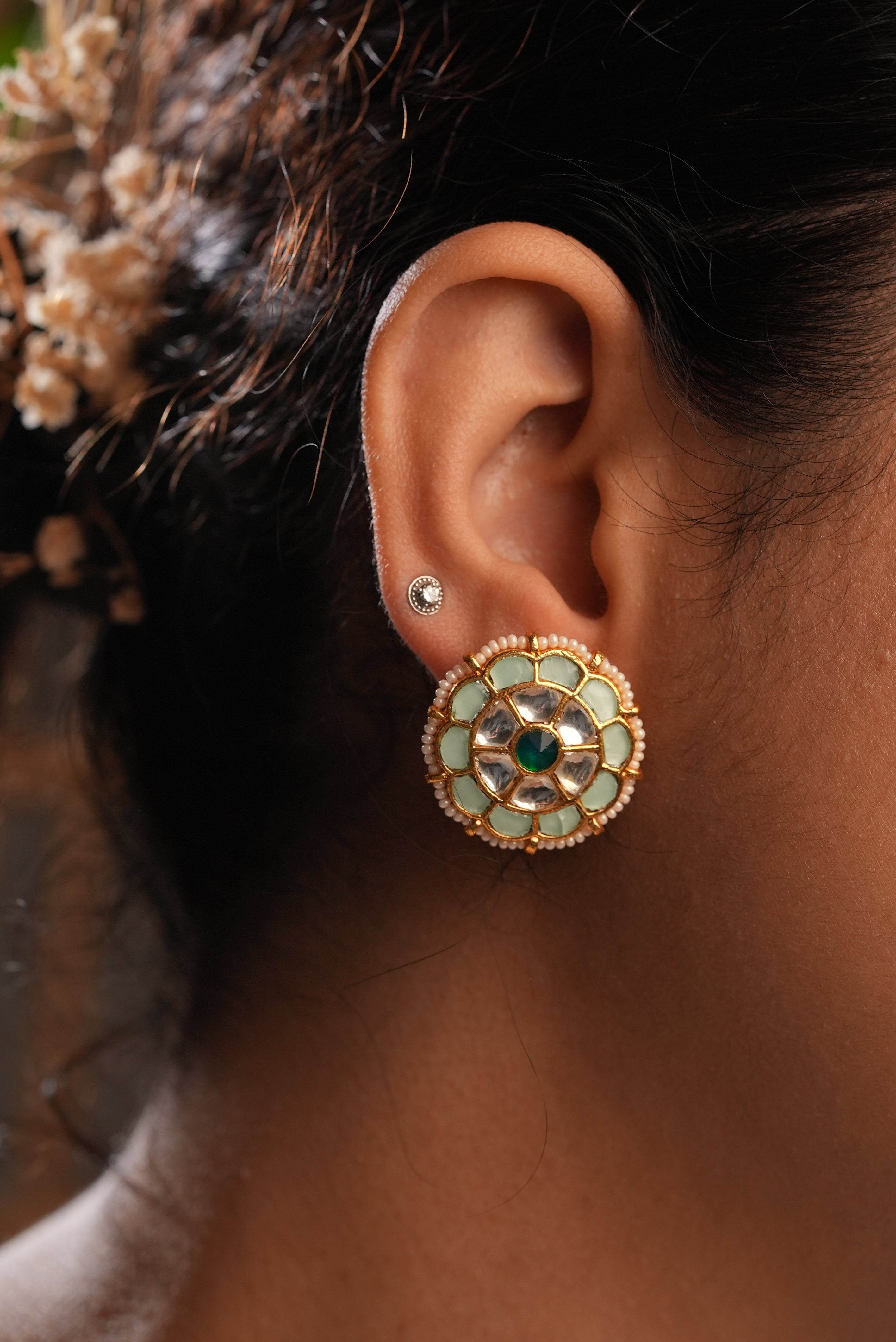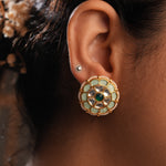 with round earrings with moozanite polki stones and sparkling