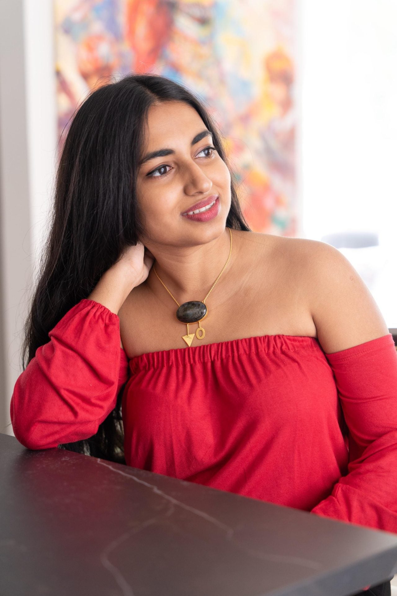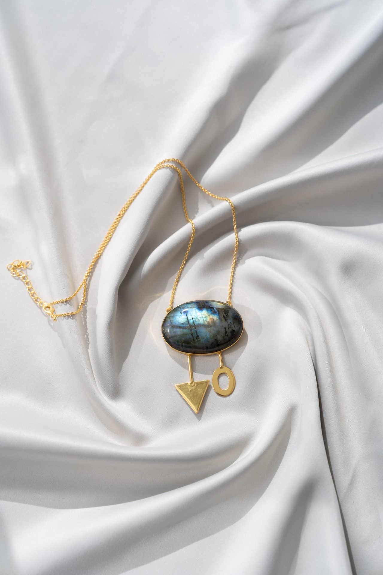 Materials Used: A stunning Labradorite pendant with a spiritual symbol that represents the mind, body, and soul. Strung in a gold-plated chain.