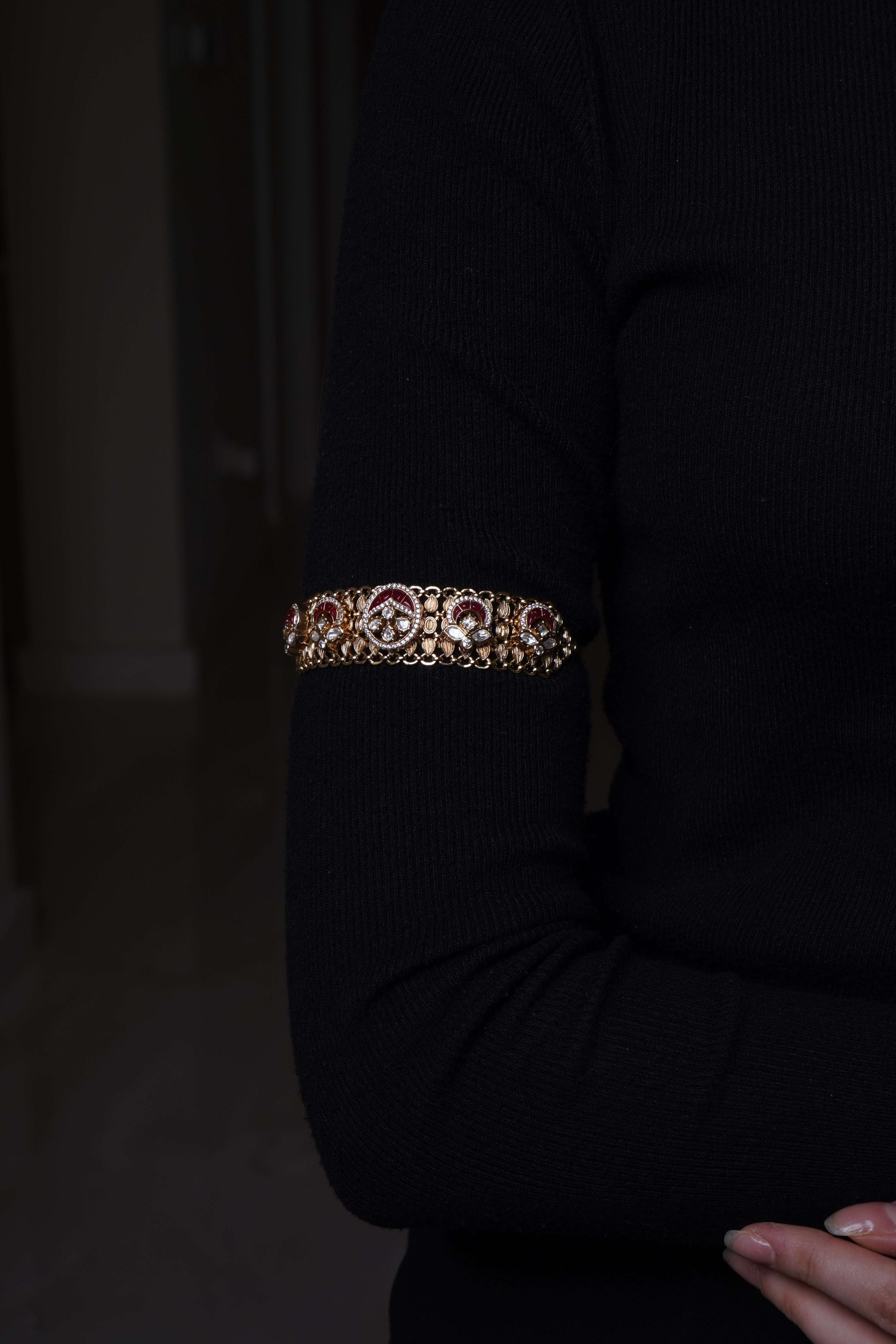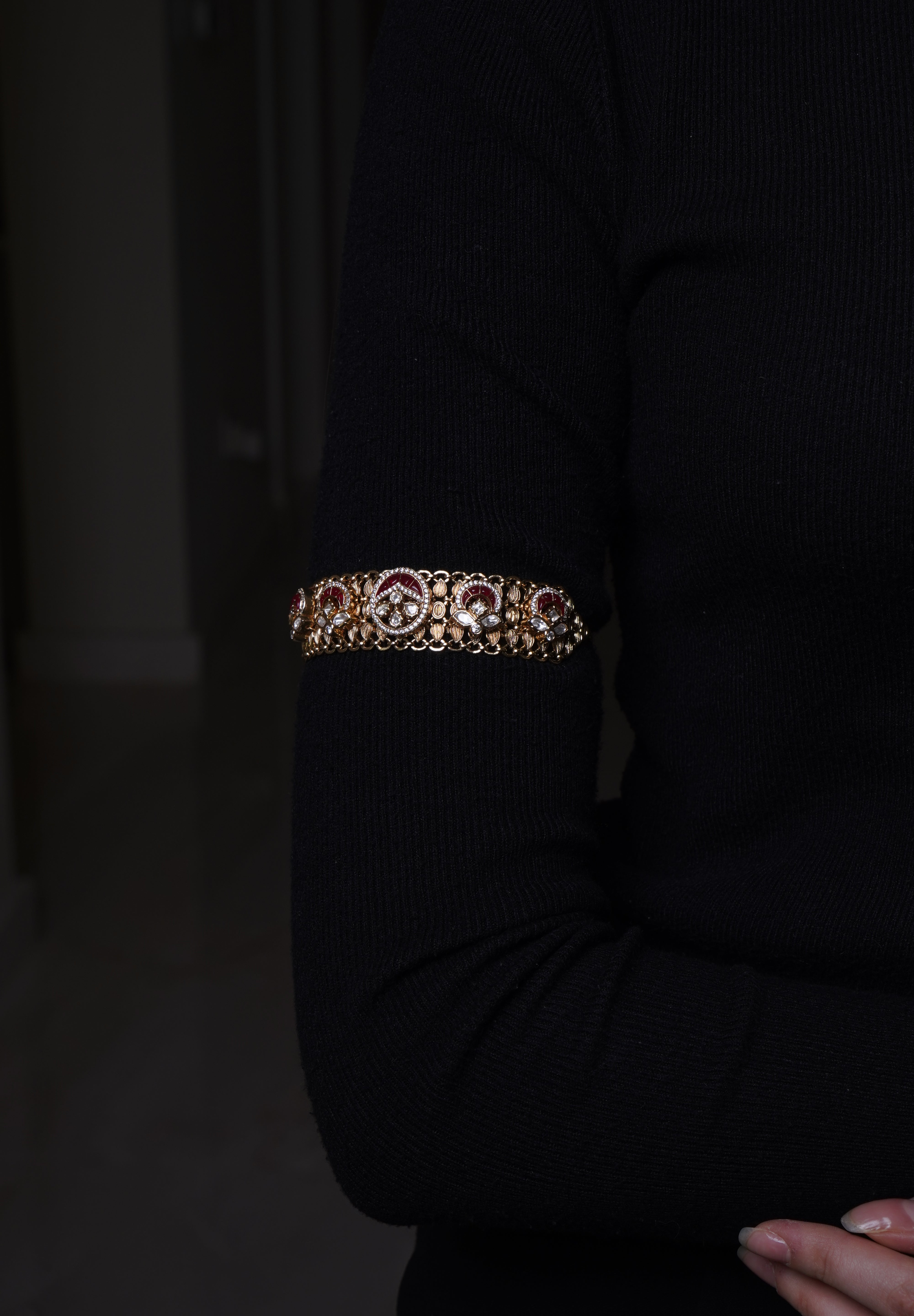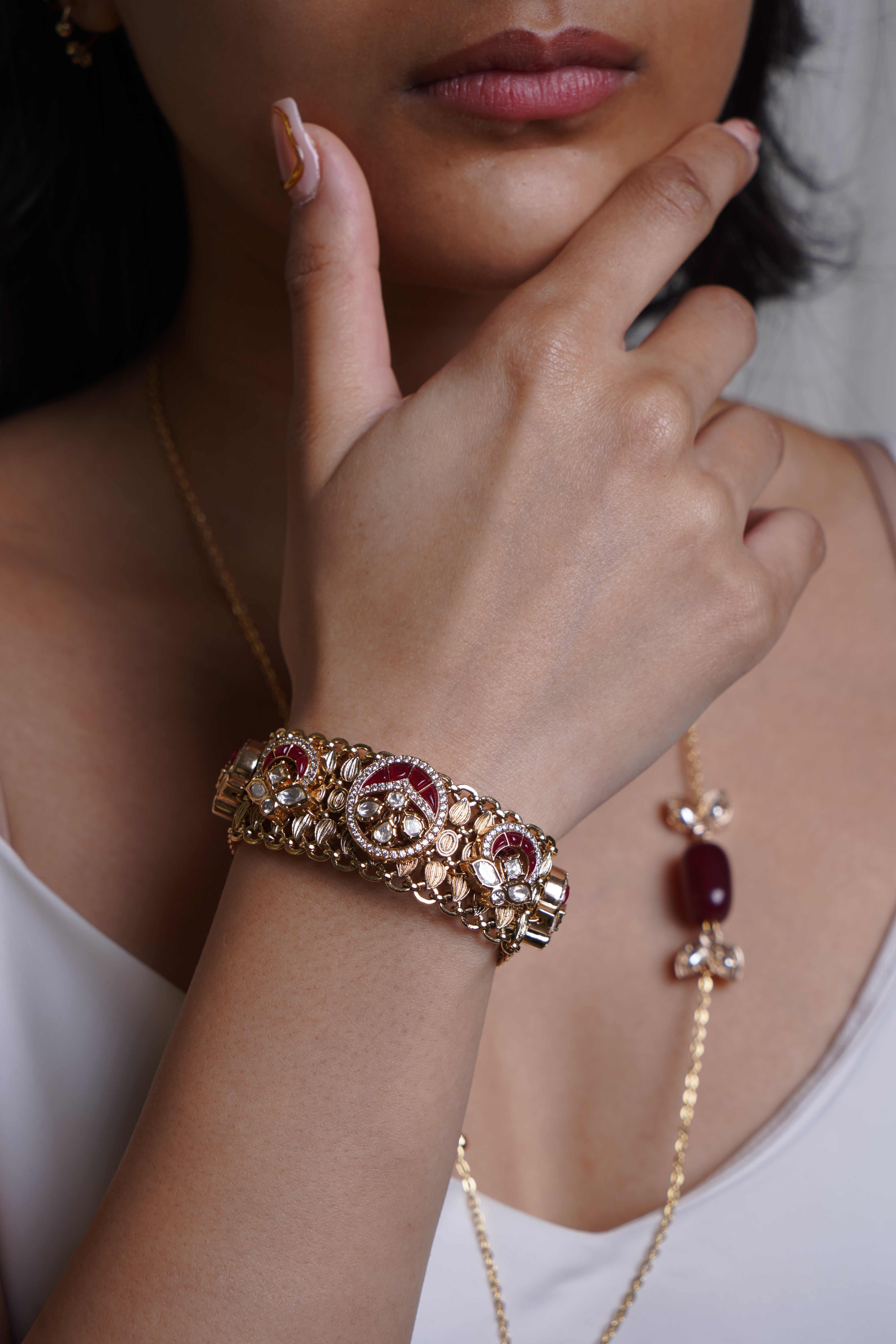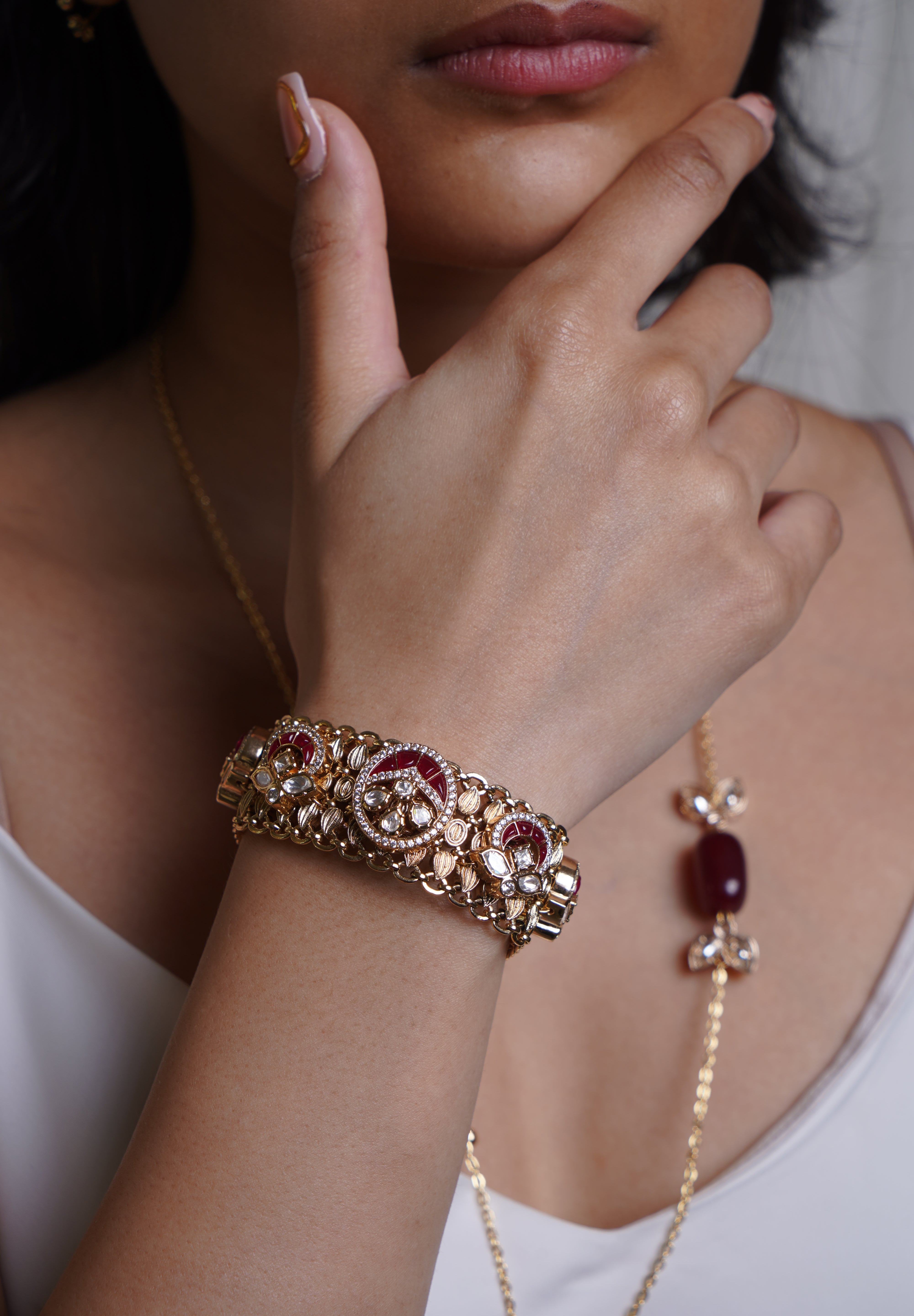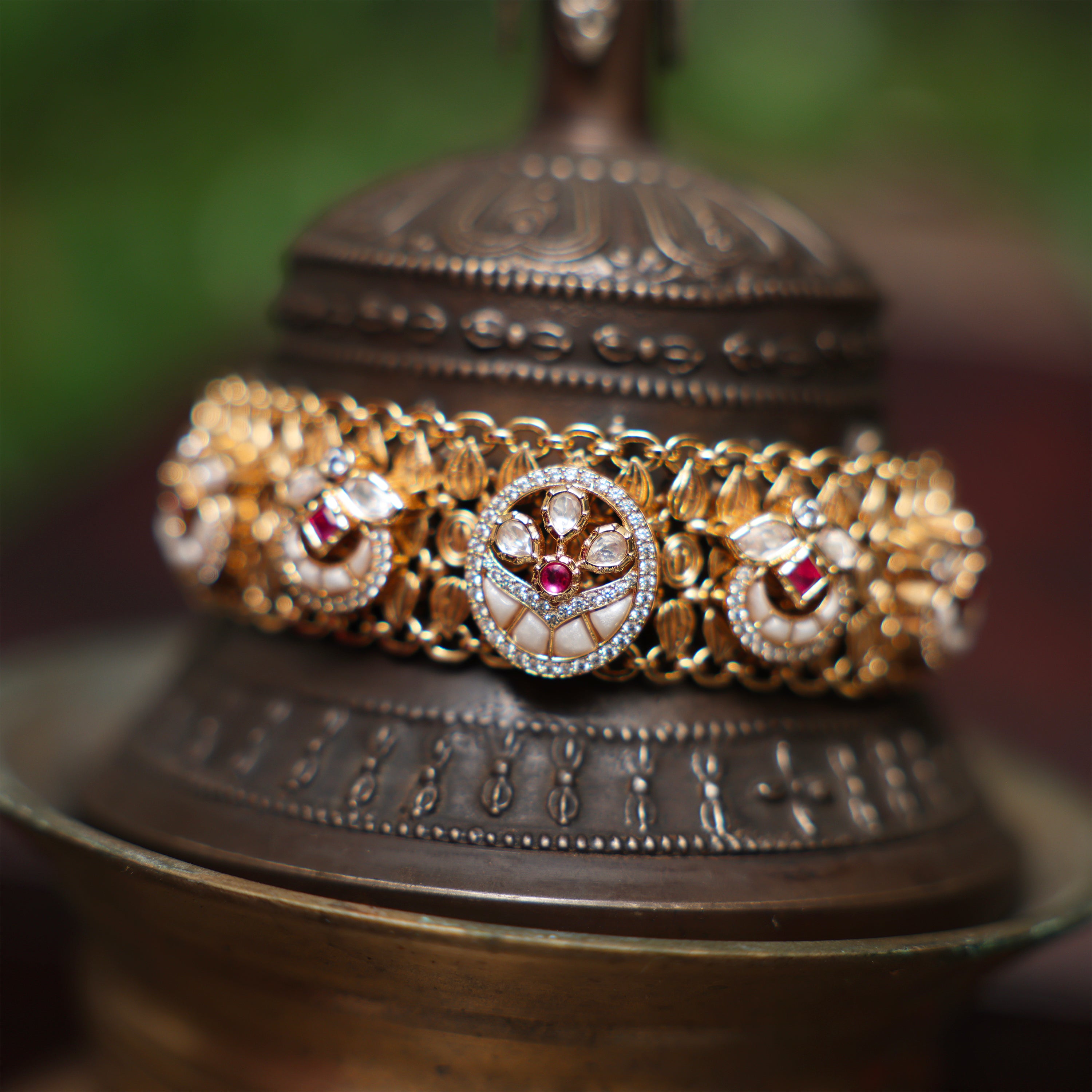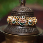 A graceful bracelet featuring intricate temple-inspired carvings, kundan embellishments, and a rich gold-plated finish, perfect for a traditional touch.