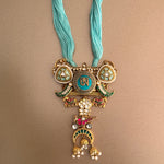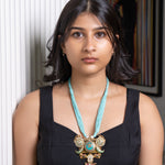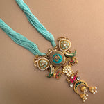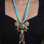 Himalayan Serenity: Sky Blue Thread Necklace with Tibetan Pendant & Jewel-Adorned Jhumki Drops" - Isaana Collection