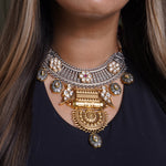A powerful statement piece with handcrafted temple-style motifs and kundan accents, made with anti-tarnish copper base and 1gm gold forming for a rich, traditional look.
