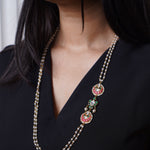A refined long chain featuring detailed temple motifs and lustrous pearls, kundan and gemstones, blending heritage with sophistication.