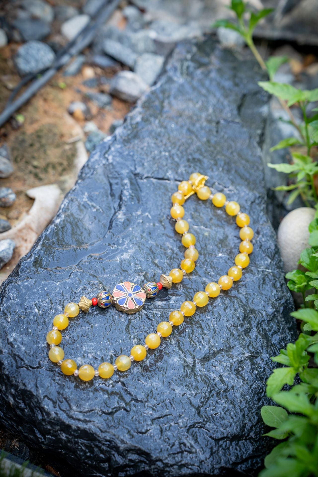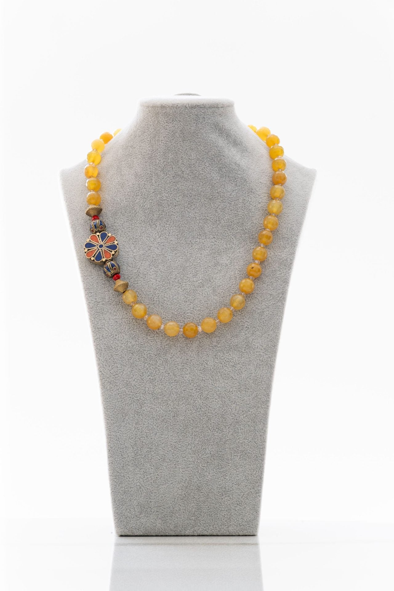 Signature beaded necklace with Tibetan Side pendant and Yellow beads