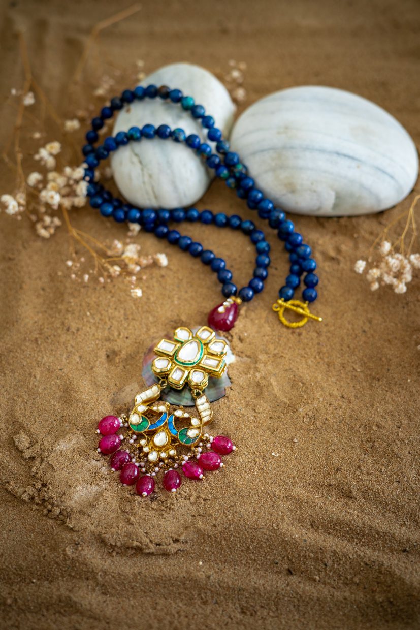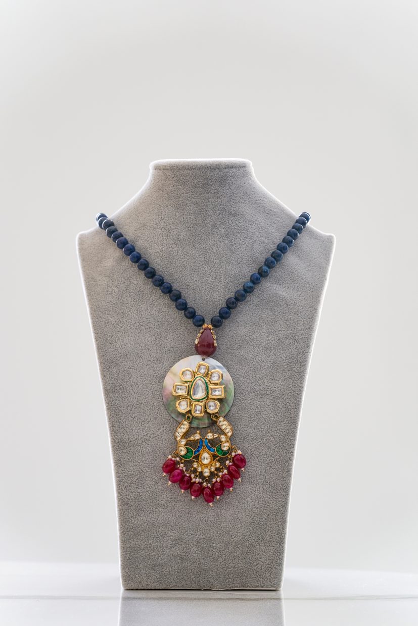 Dimensions: 50 Cms Weight:125 Gms Length: adjustable with links Materials Used: shell mother of pearl, kundan, and onyx beads